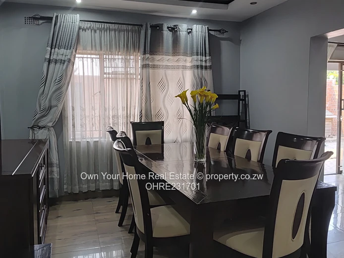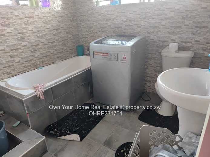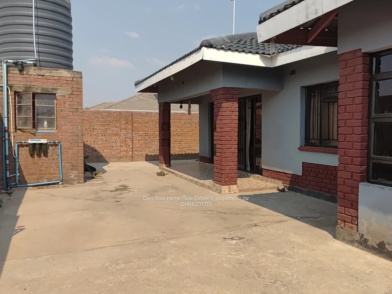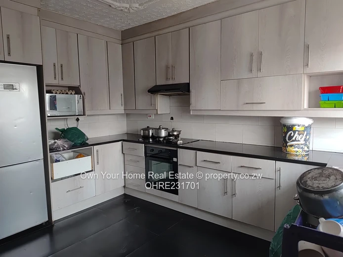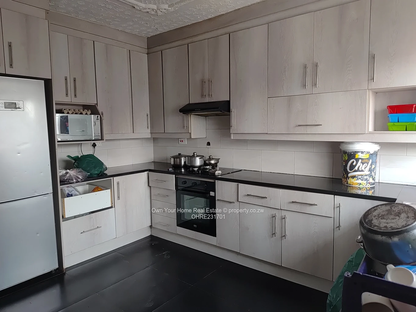 Modern house for sale. Compromising 6 bedrooms all with bics, main bedroom ensuite, spacious lounge cum dining room, fitted kitchen with granite tops hob and oven and scullery, 1kva solar system, 5000ltr tank and outside store room, walled and gated on 400sqm, paved throughout. Developer cession