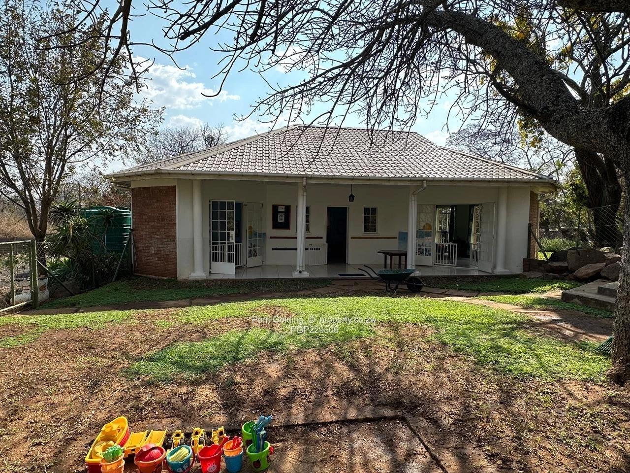 Additional features include staff quarters, carports, storerooms, a water tank and garage. The property spans 6714 square meters and is secured with a wall, ensuring a safe atmosphere for children.