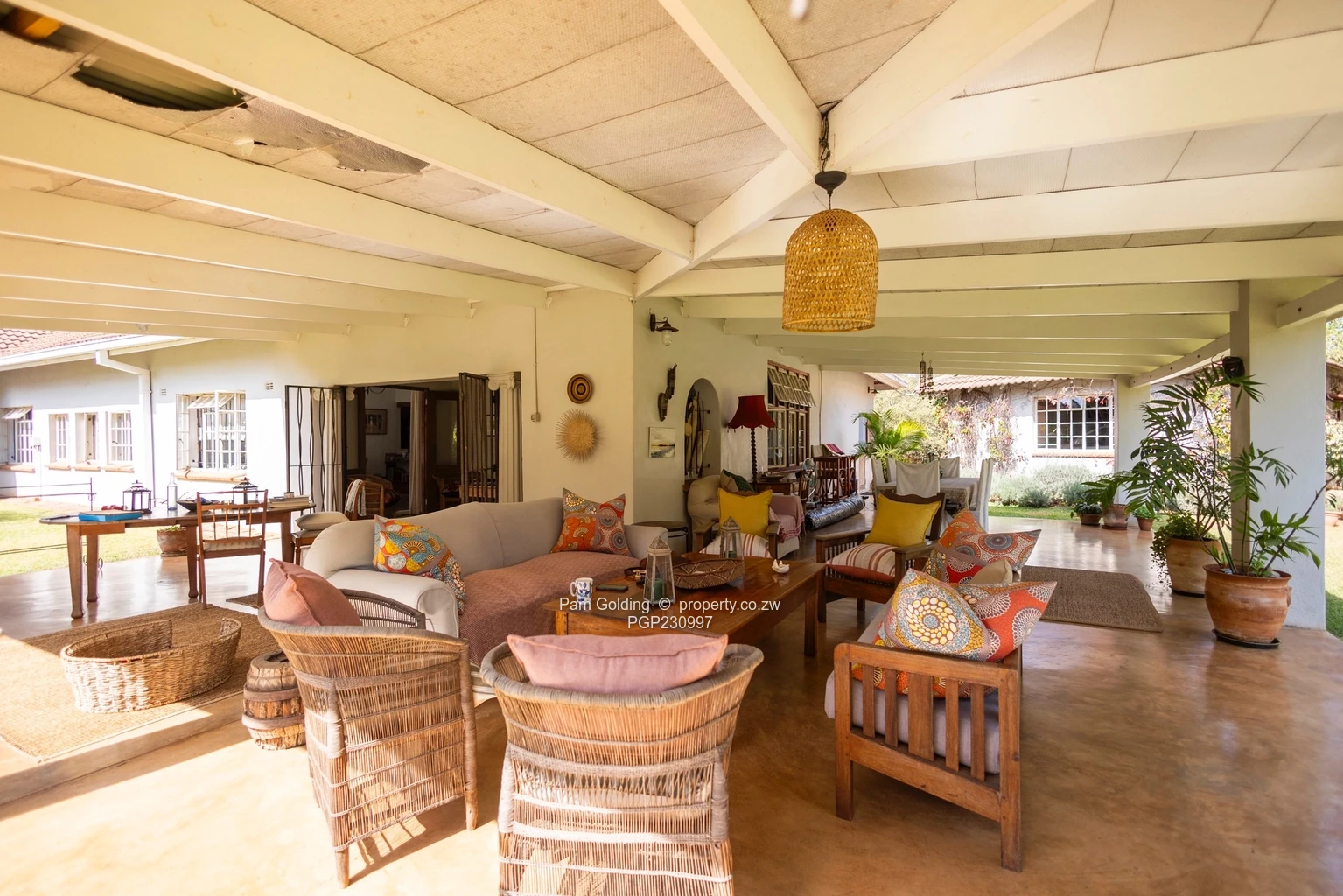 The house offers ample comfortable space with 4 bedrooms, spacious living areas, fitted kitchen, garages, swimming pool , mature garden, borehole and staff accomodation.