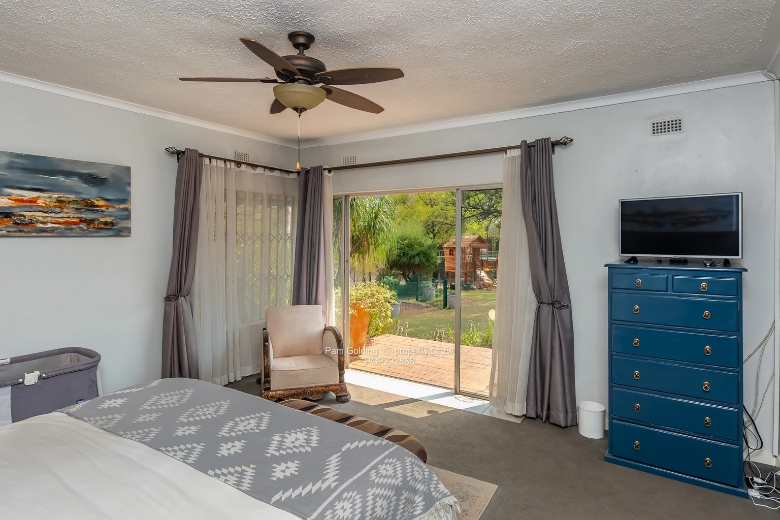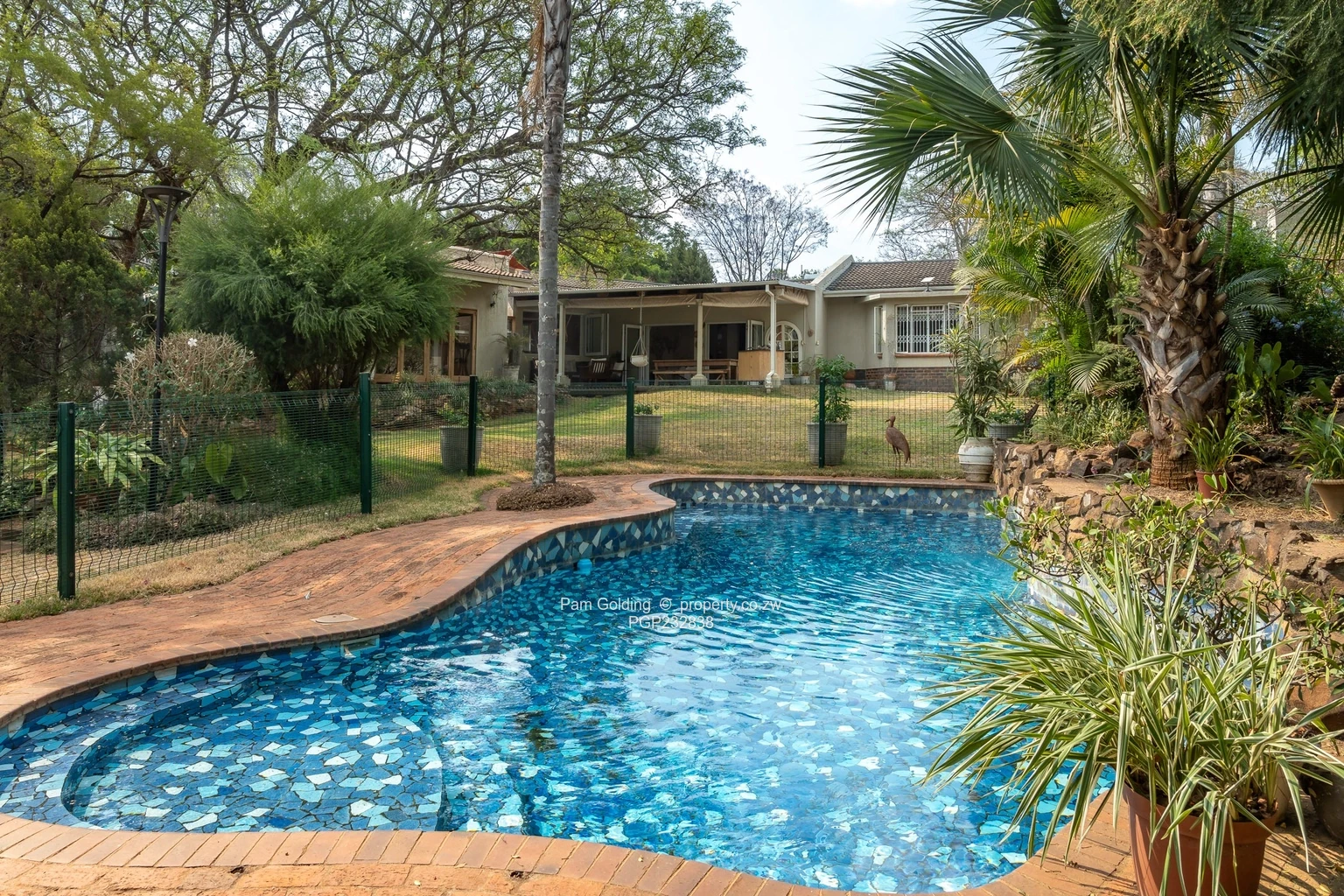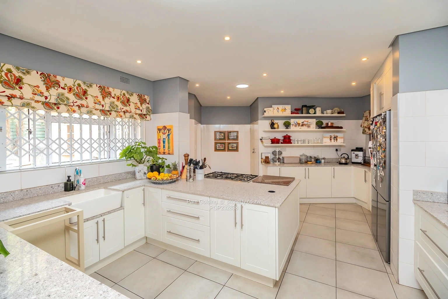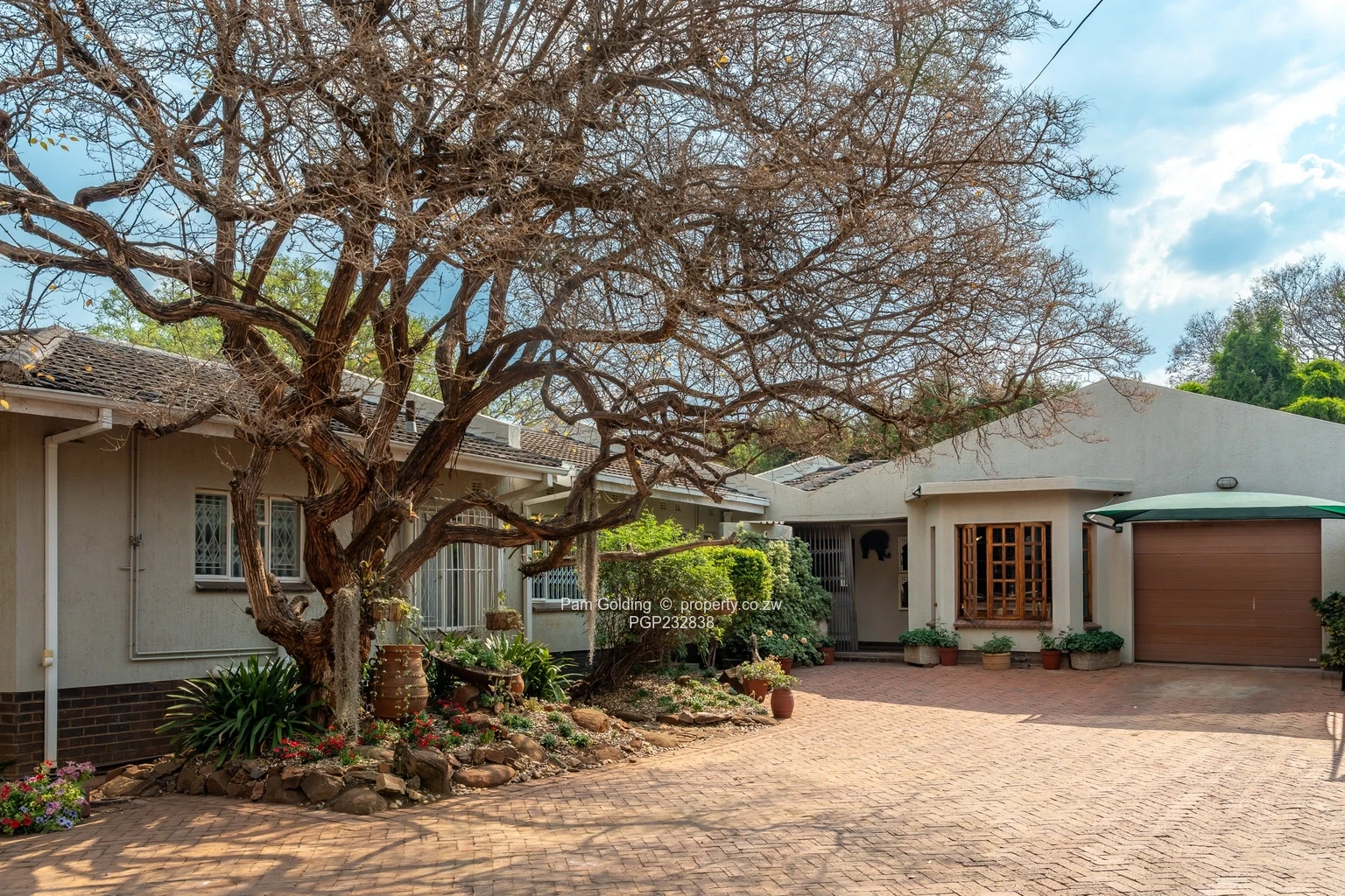 This 4,797sqm property offers space, security, and modern comfort—completely move-in ready. Fully walled and gated, it features an electric fence and external alarm system for peace of mind. The main residence is a newly renovated, single-storey brick home under tile, designed with quality finishes and a practical layout. The left wing includes four bedrooms—two en-suite and two sharing a family bathroom—plus a playroom or second lounge opening onto a covered verandah. The right wing offers a dining area, family lounge, and modern open-plan kitchen with walk-in pantry, scullery, secondary prep area, and built-in office nook. The scullery connects to the back garden, double lock-up garage, and a separate office. The verandah extends to a well-designed entertainment area with bar, storeroom, swimming pool, tennis court, and thatched gazebo. A 5kVA solar system and extensive water storage ensure convenience and sustainability. Ideally located within a 5km radius of Sam Levy’s Village and St John’s School. A two-bedroom staff accommodation completes this exceptional property.