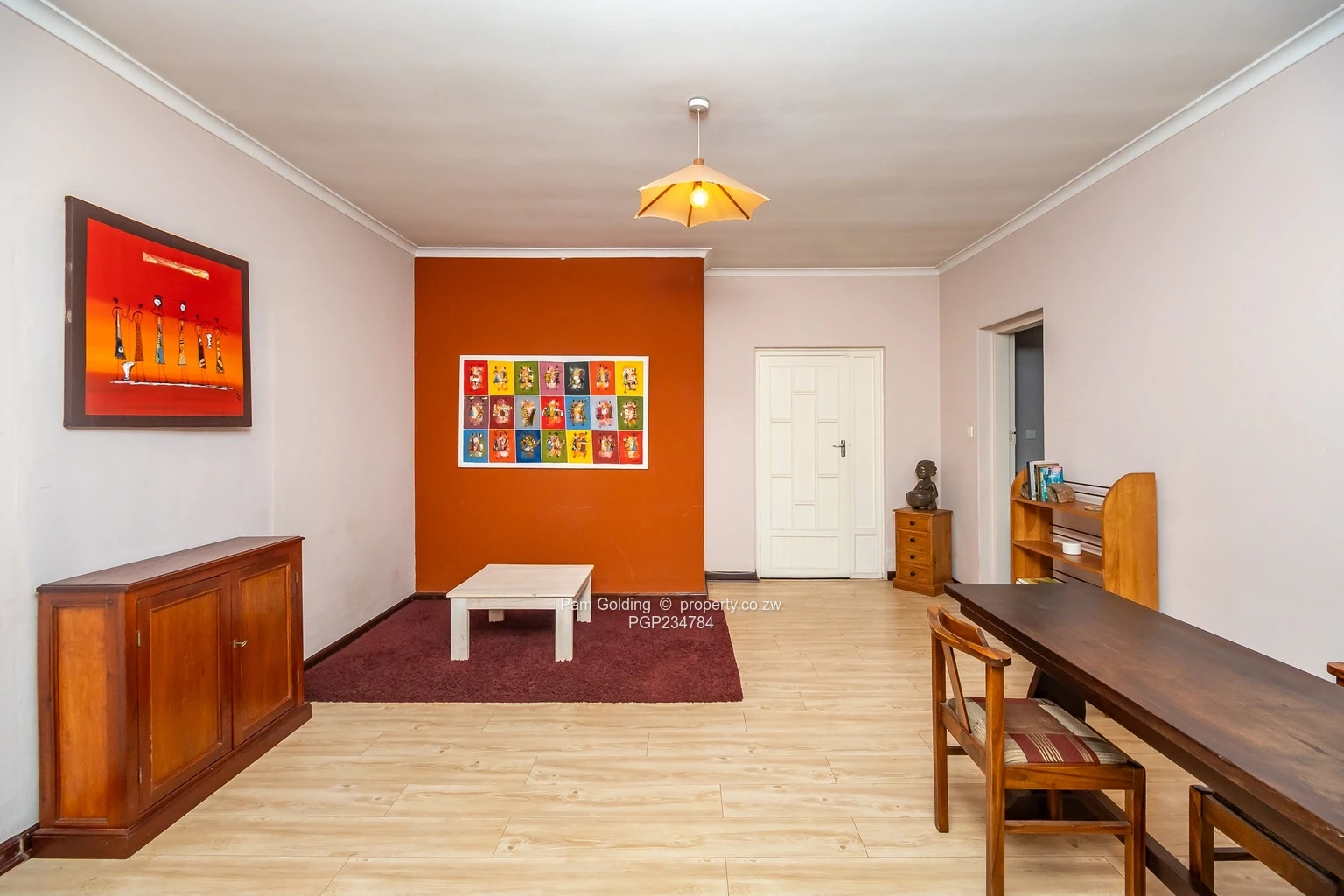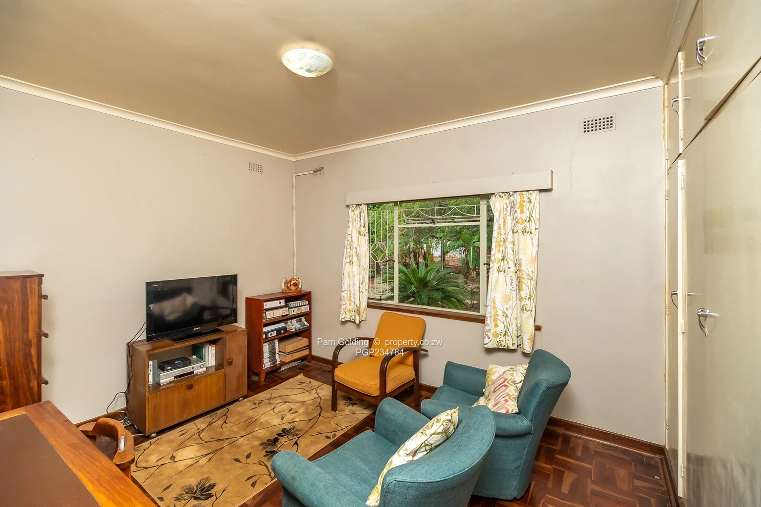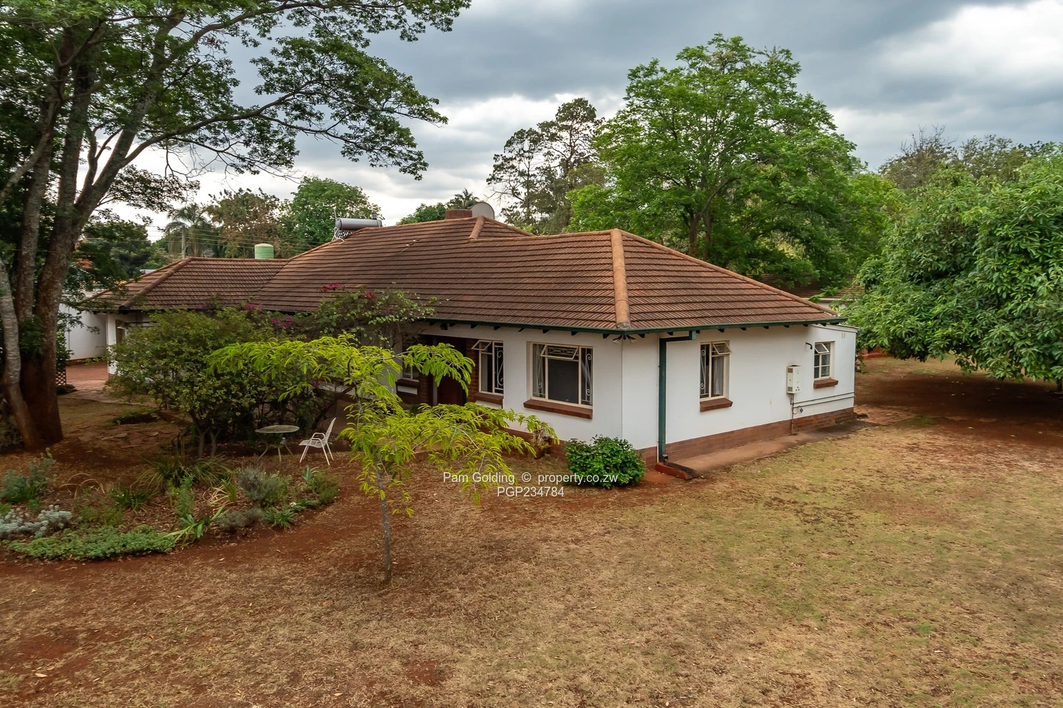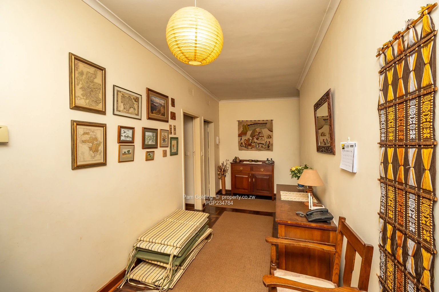 The main house features three comfortable bedrooms, all with built-in cupboards, and a full bathroom with a bath, toilet, and basin, plus a separate guest toilet. The lounge could serve very well as a boardroom and leads onto a small dining room and kitchen.