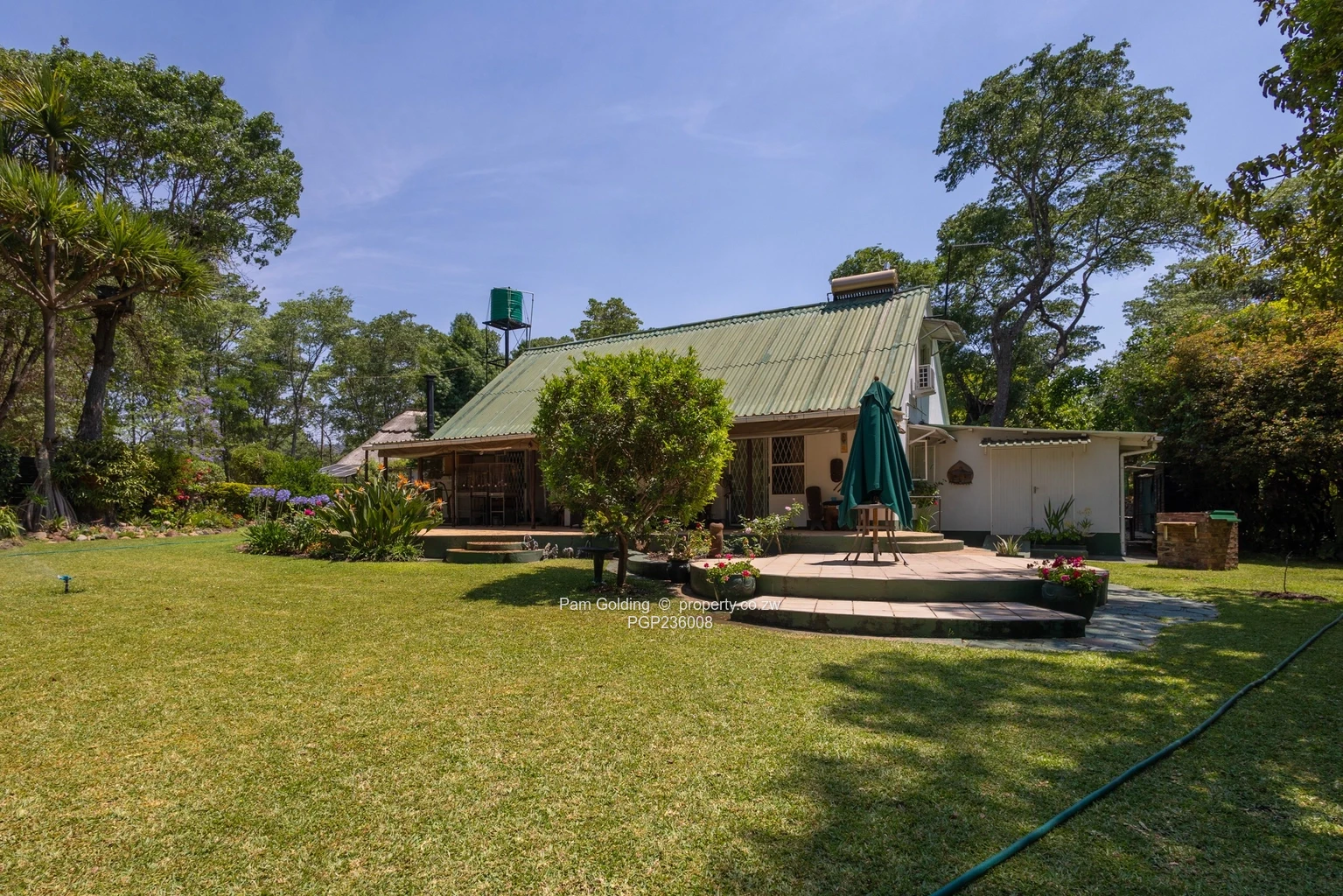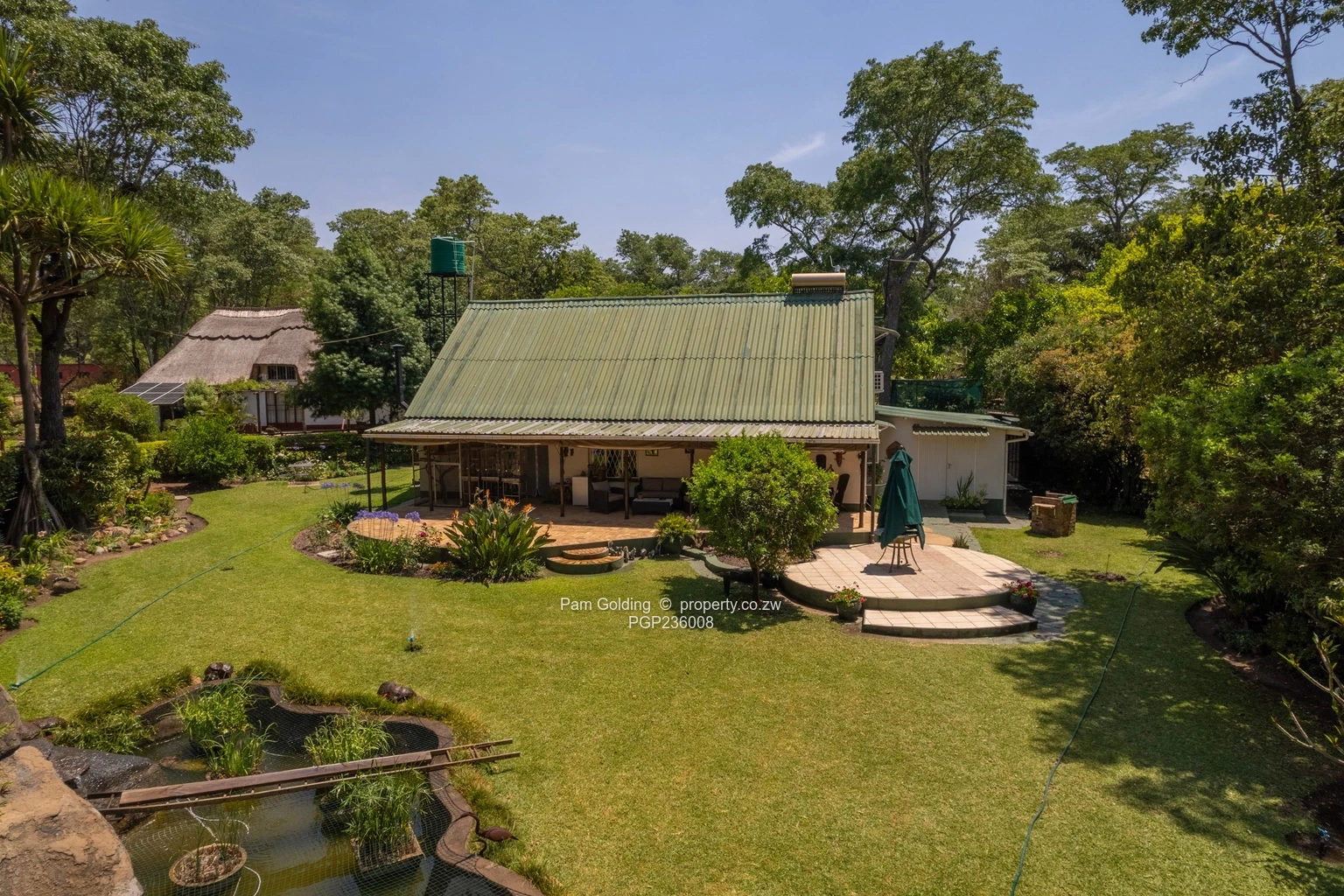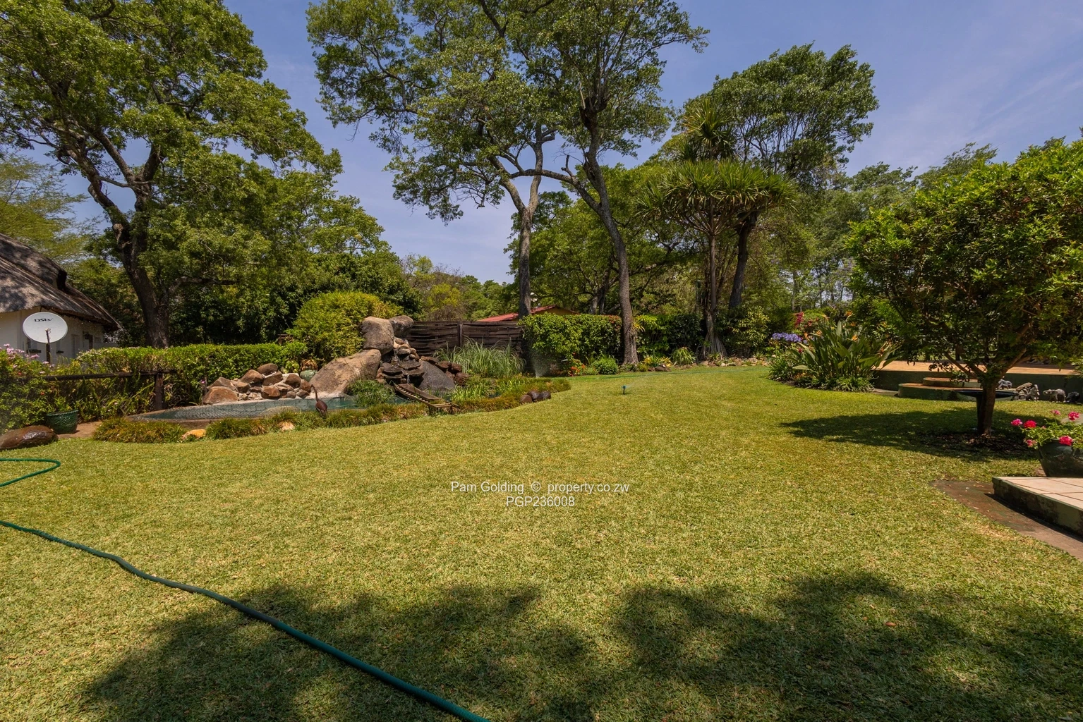 Beautiful front garden with emerald lawn, indigenous trees, water feature, and fish pond