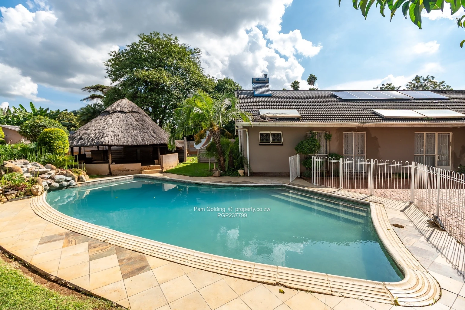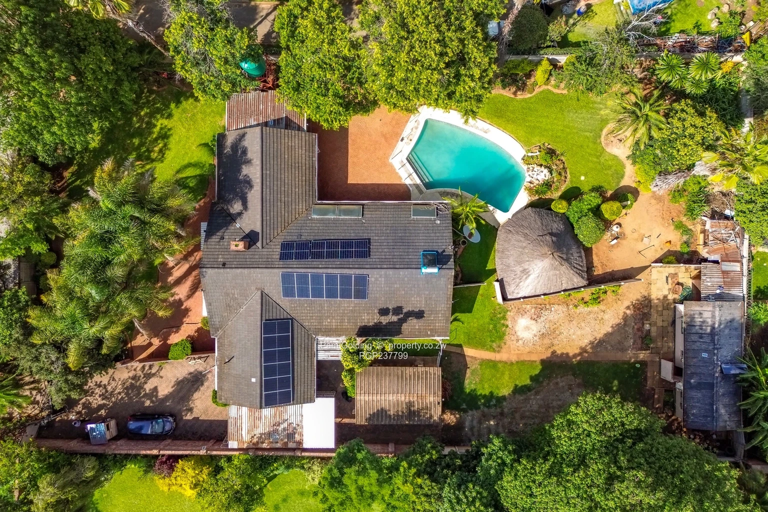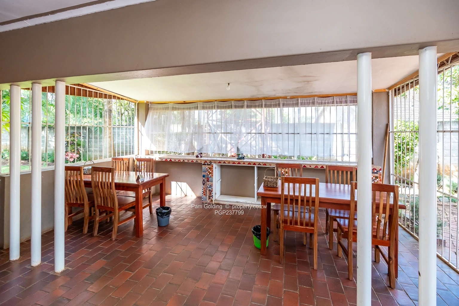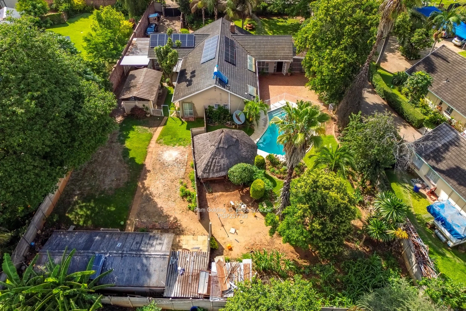 The property features a 4-bedroom main house (master with en-suite and walk-in closet), fitted kitchen with pantry, spacious lounge with fireplace, dining room, and covered veranda—all tiled throughout. Additional amenities include a swimming pool with thatched gazebo, double staff quarters, double carport, and a separate outbuilding with two offices.