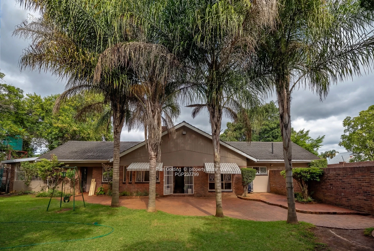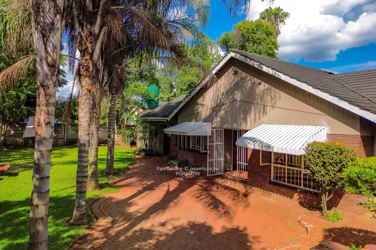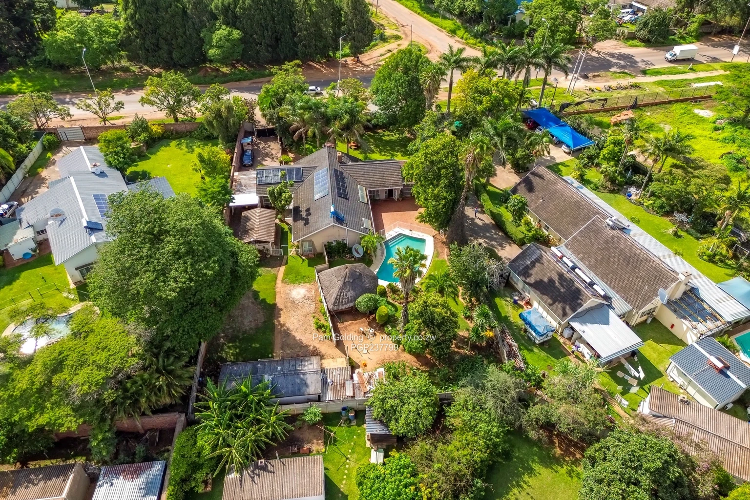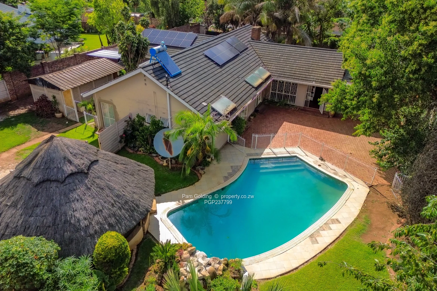 The property features a 4-bedroom main house (master with en-suite and walk-in closet), fitted kitchen with pantry, spacious lounge with fireplace, dining room, and covered veranda—all tiled throughout. Additional amenities include a swimming pool with thatched gazebo, double staff quarters, double carport, and a separate outbuilding with two offices.