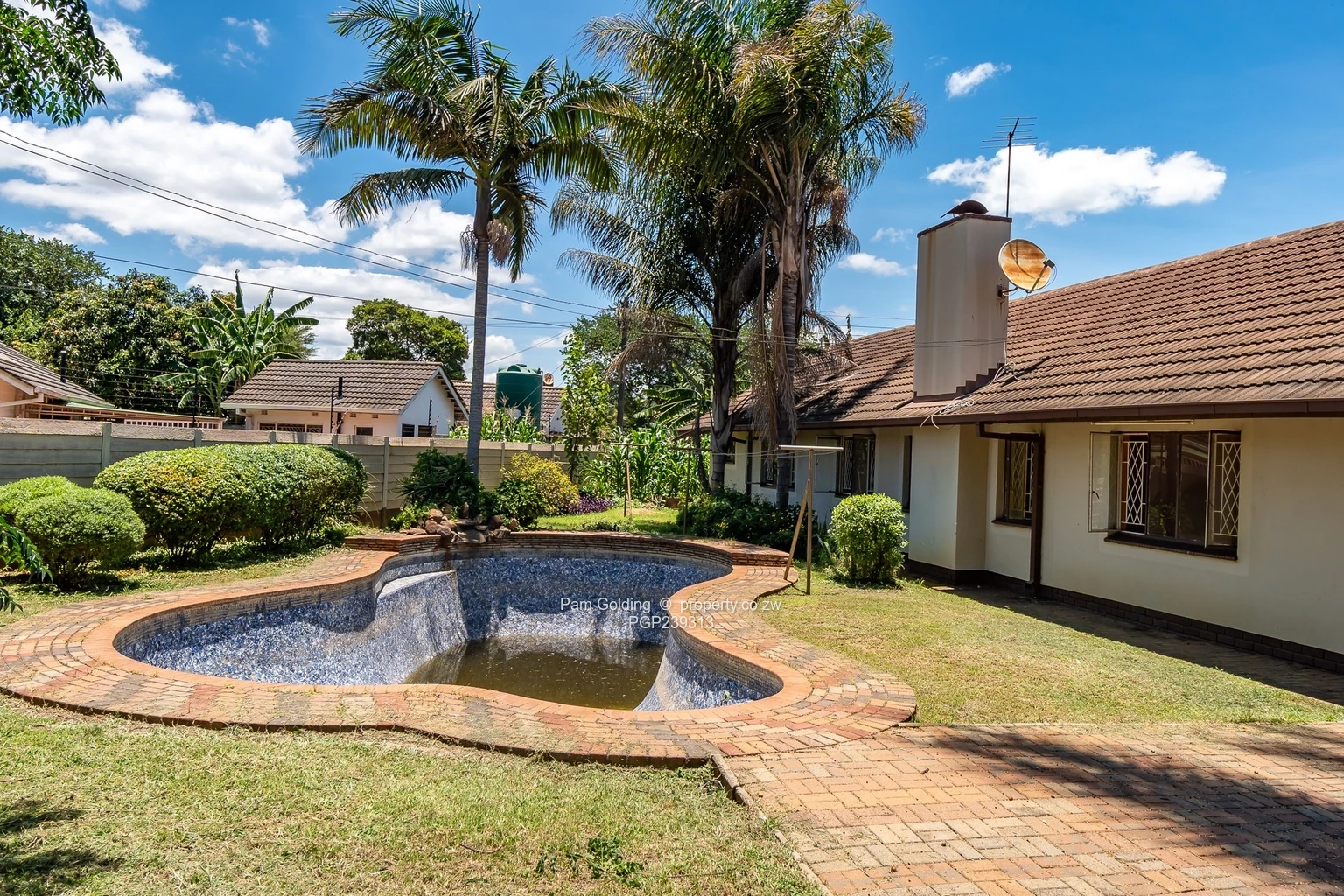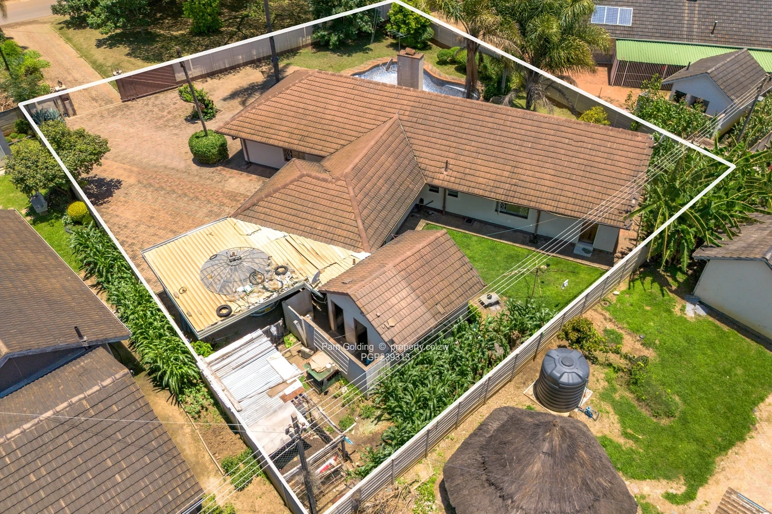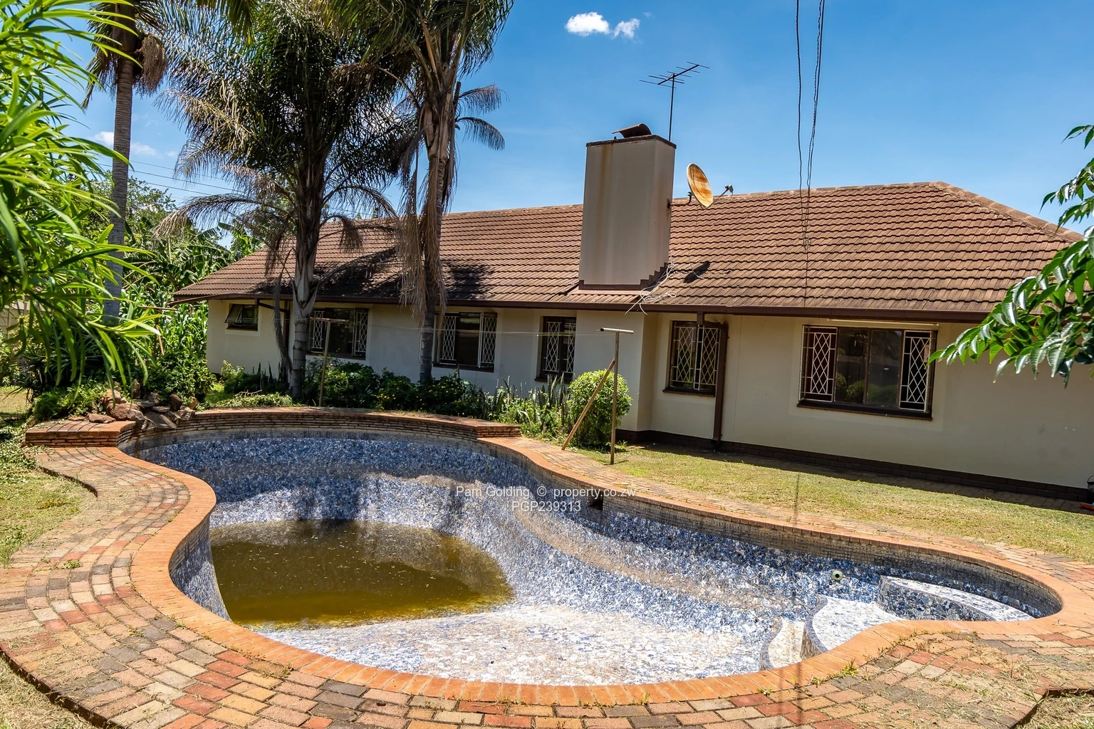 Additional features include a double carport, single staff quarters with a kitchen and shower with toilet and a disused swimming pool. The property is fully walled and gated, offering added security and privacy.