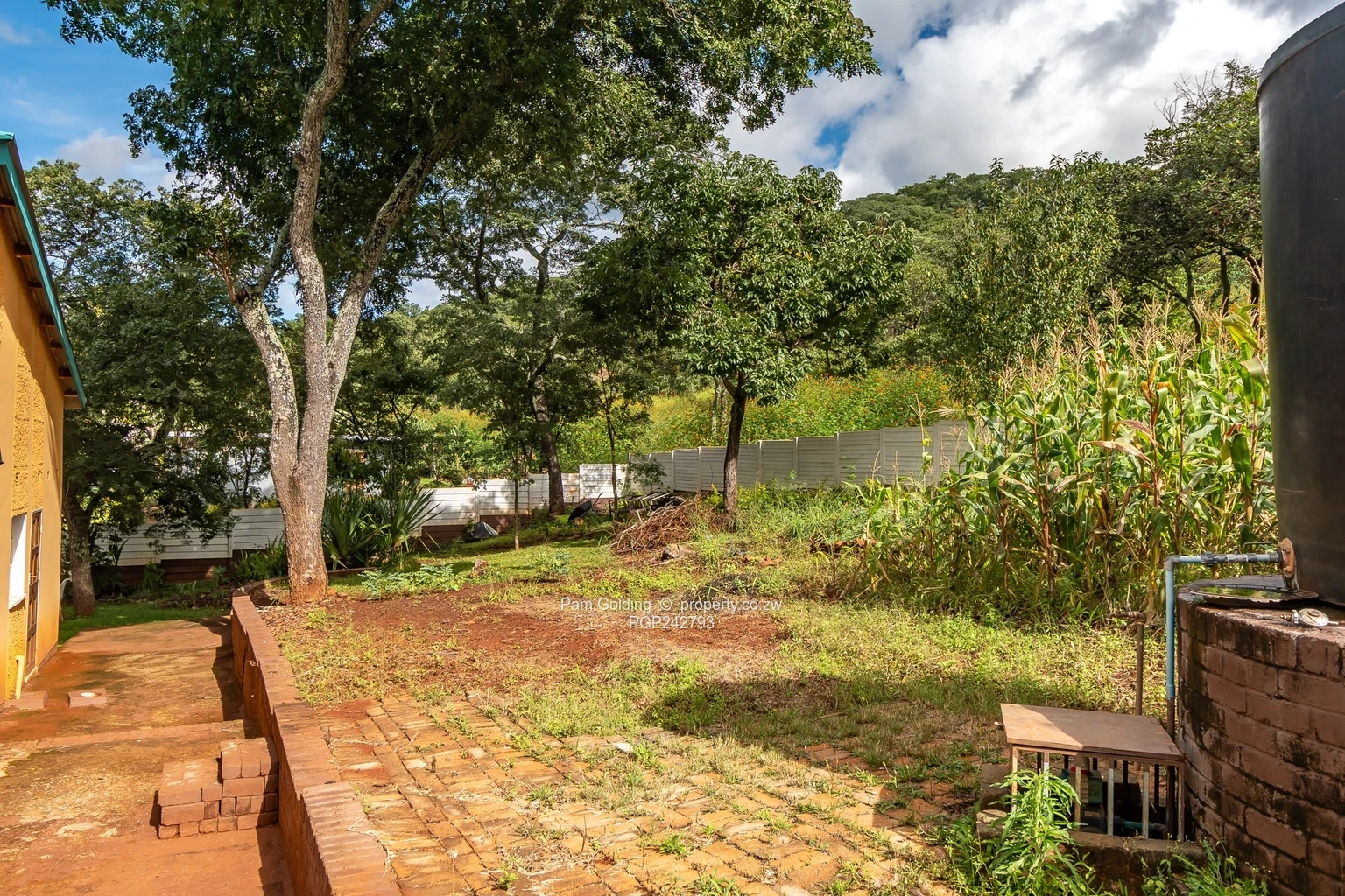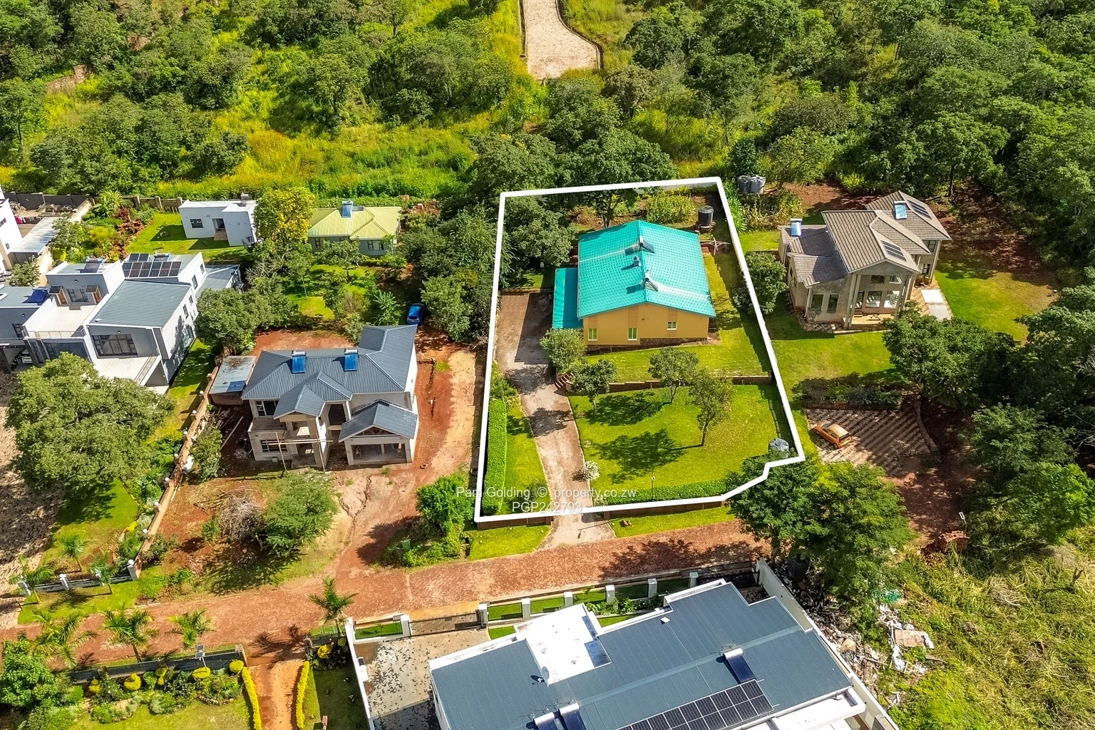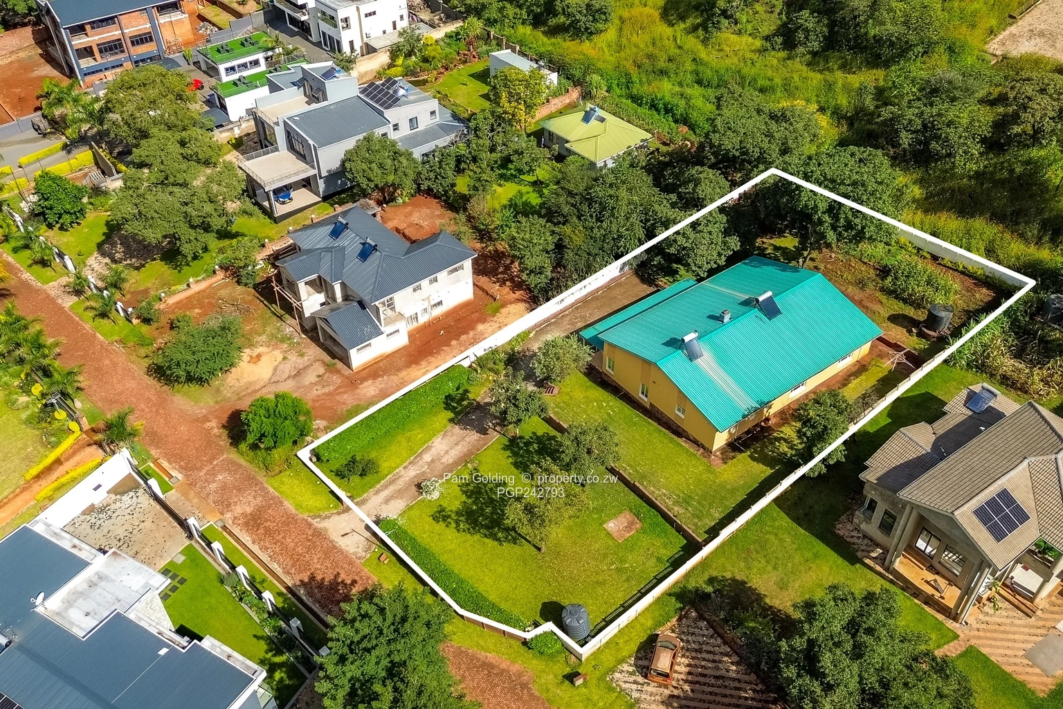 The property is fully walled with a neat front lawn and mature trees visible in the aerial shot, a long driveway and clear boundaries for privacy. A covered verandah and established garden provide excellent outdoor entertaining space, while the fitted kitchen gives practical everyday convenience. Additional highlights include 24-hour security and access control for peace of mind, a water tank on site and generous parking. Ideal for families or investors seeking a peaceful Harare North address with renovation potential and strong curb appeal. Schedule a viewing today.