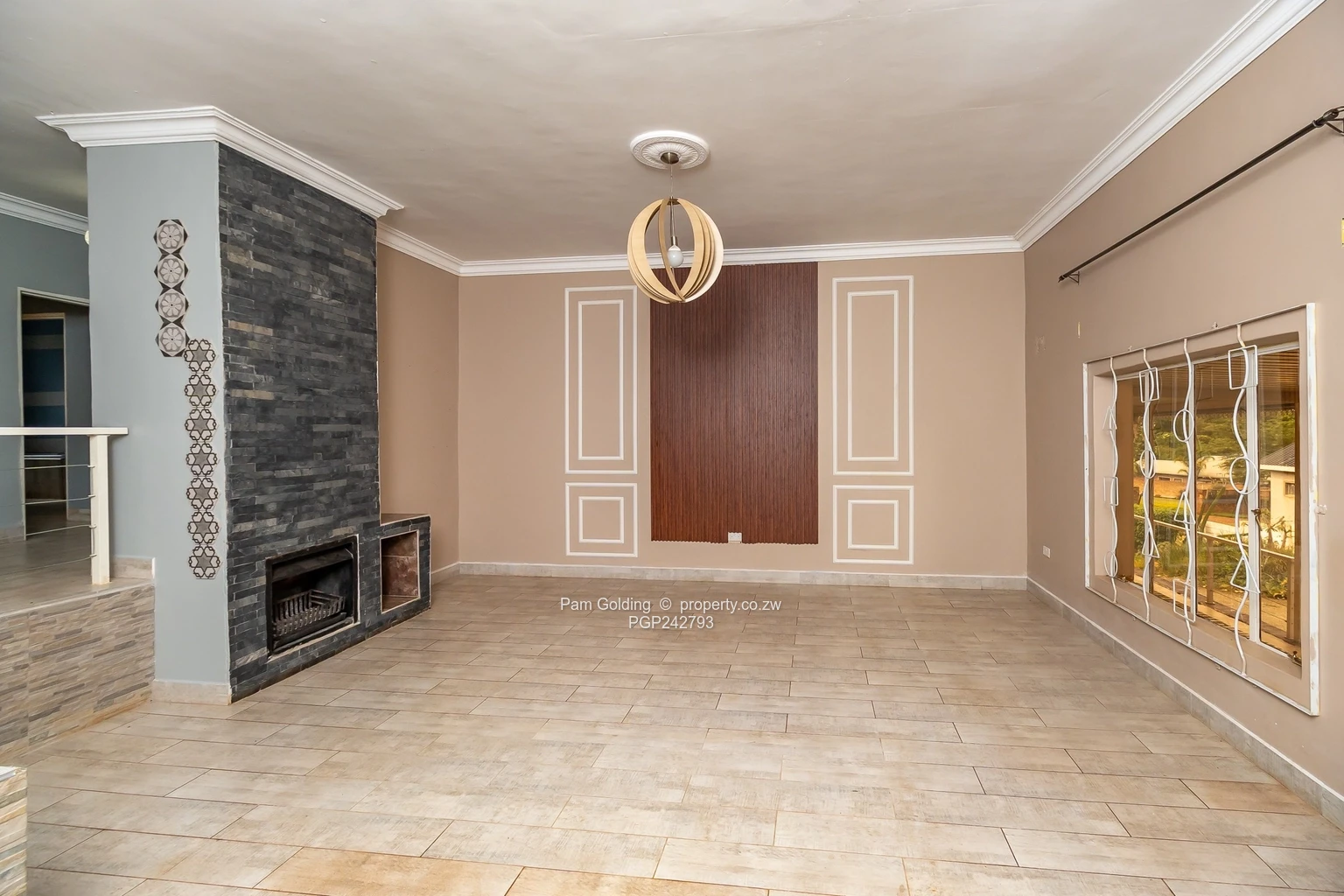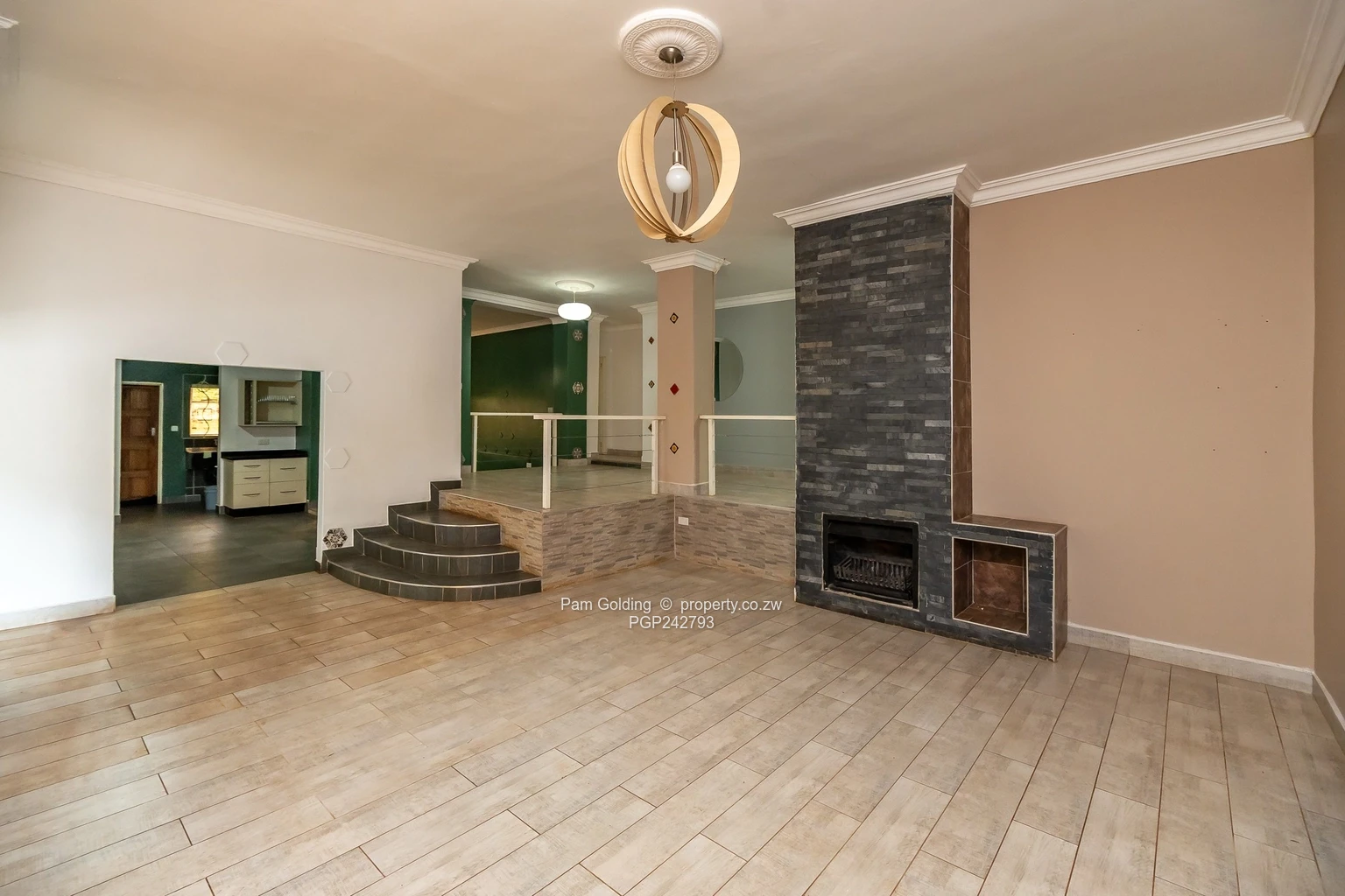 House for Sale – Hogerty Hill, Harare North. A spacious family home on a generous 2,000 m² stand with 500 m² of building space: 3 bedrooms and 3 bathrooms, including a main en suite. As seen in the photos, the main bedroom features built-in wardrobes and a glass-enclosed en-suite shower; the family bathroom offers both a bath and a separate shower. The large tiled living area steps down toward a cosy fireplace focal point, perfect for relaxed evenings.