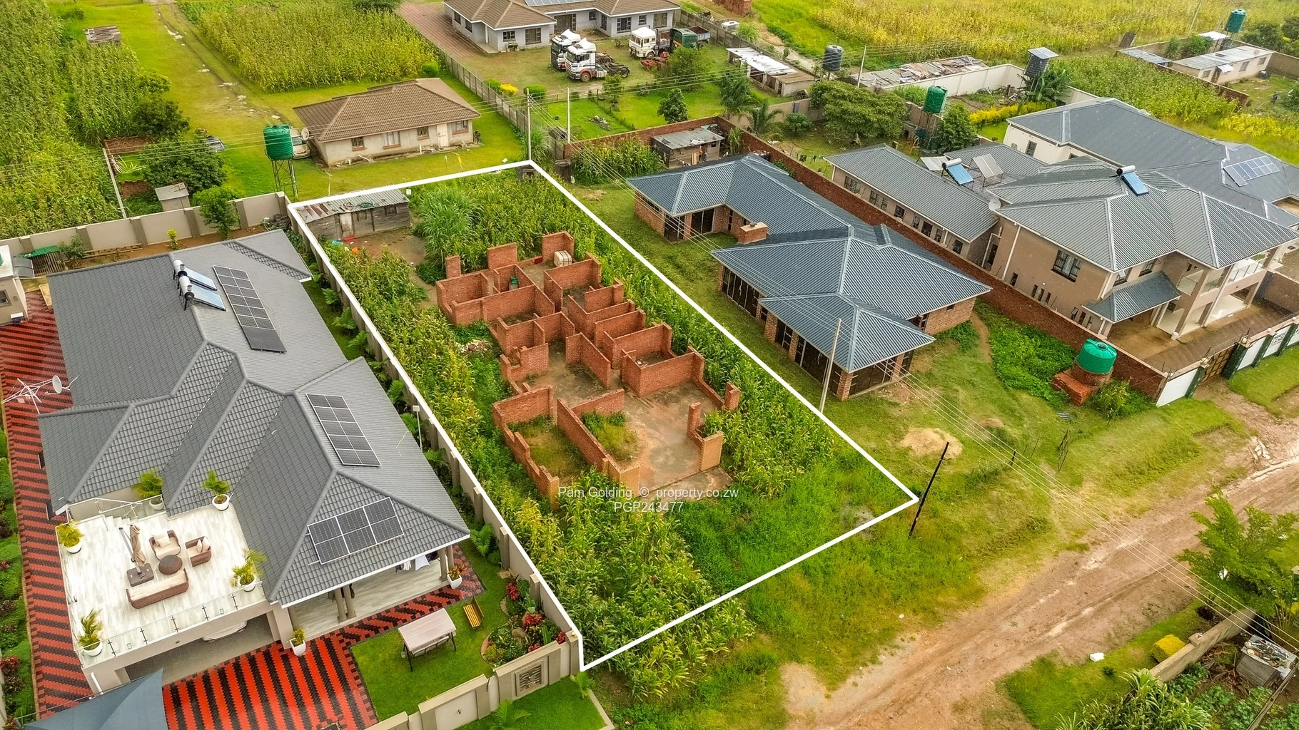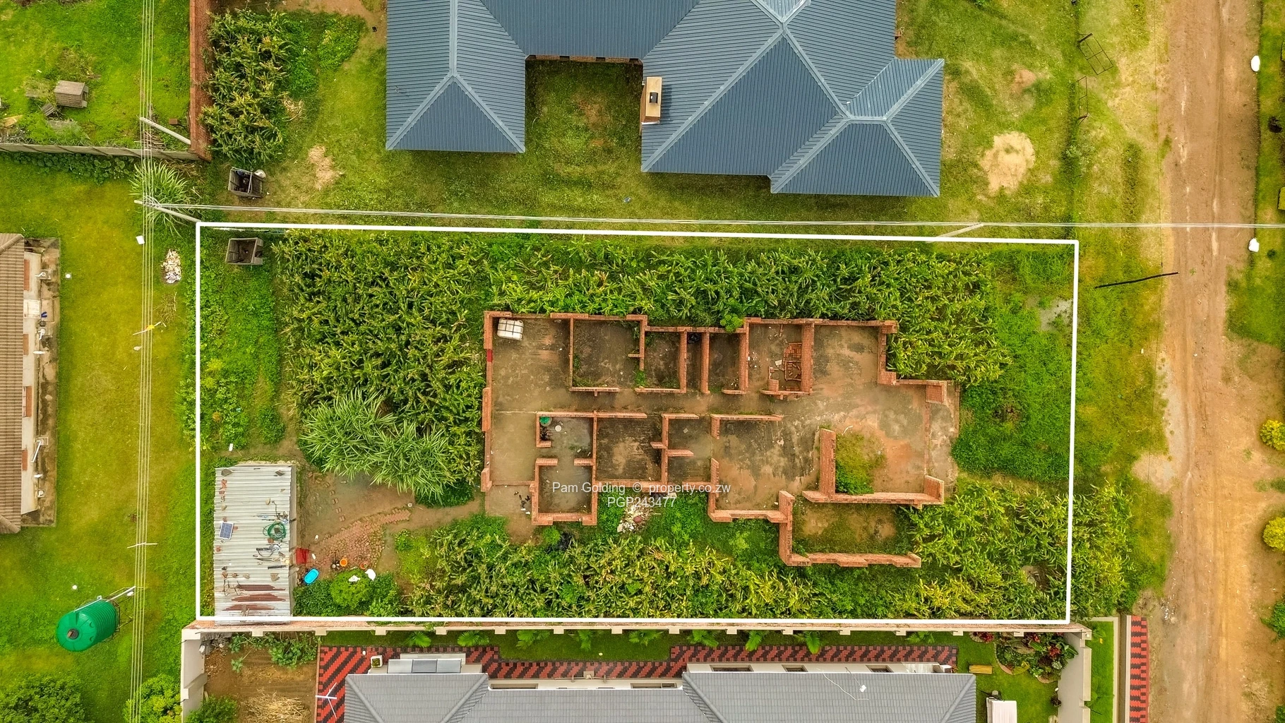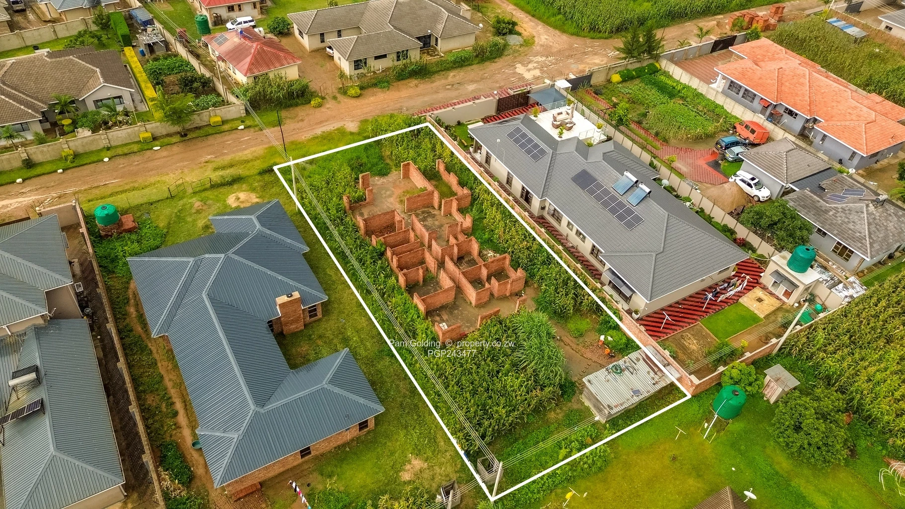 Key exterior features include a sizable veranda and additional staff quarters, catering to various needs. The property boasts reliable municipal water and Zesa, making it a practical choice. The landscaped areas with green water tanks reflect thoughtful planning for gardening or agricultural use.