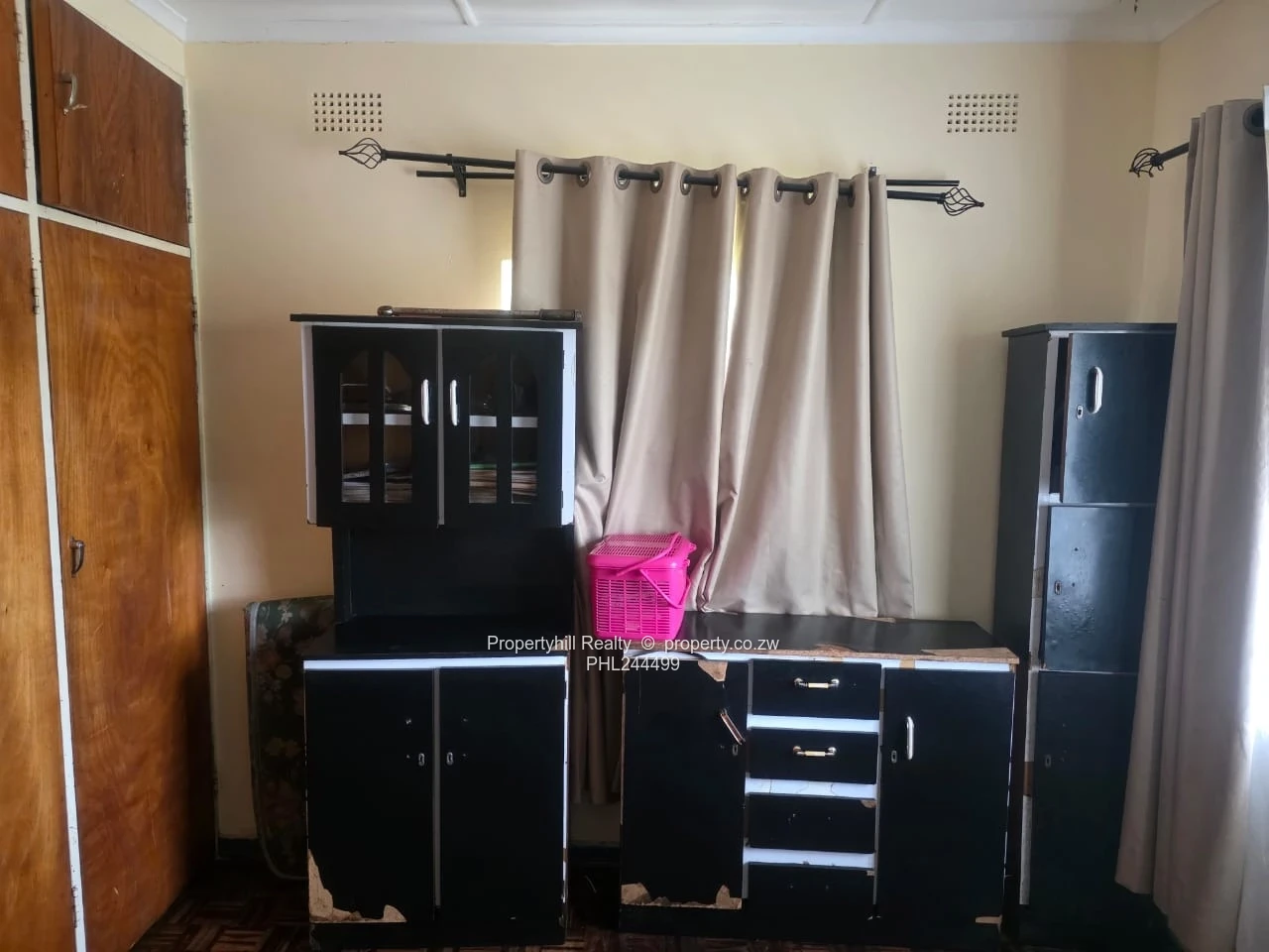 Charming single-storey family home in Manningdale, Bulawayo East — a rare 4020 m² stand with a generous 400 m² building footprint offering space, privacy and potential. The property features two comfortable bedrooms with built-in cupboards and original parquet floors (see photos), a central bathroom with a bathtub and tiled surrounds, and a relaxed lounge reached down a neat hallway. Natural light fills the rooms through security-grilled windows dressed with curtains, and the simple fitted cabinetry visible in the photos points to an opportunity for cosmetic updating to suit your style.