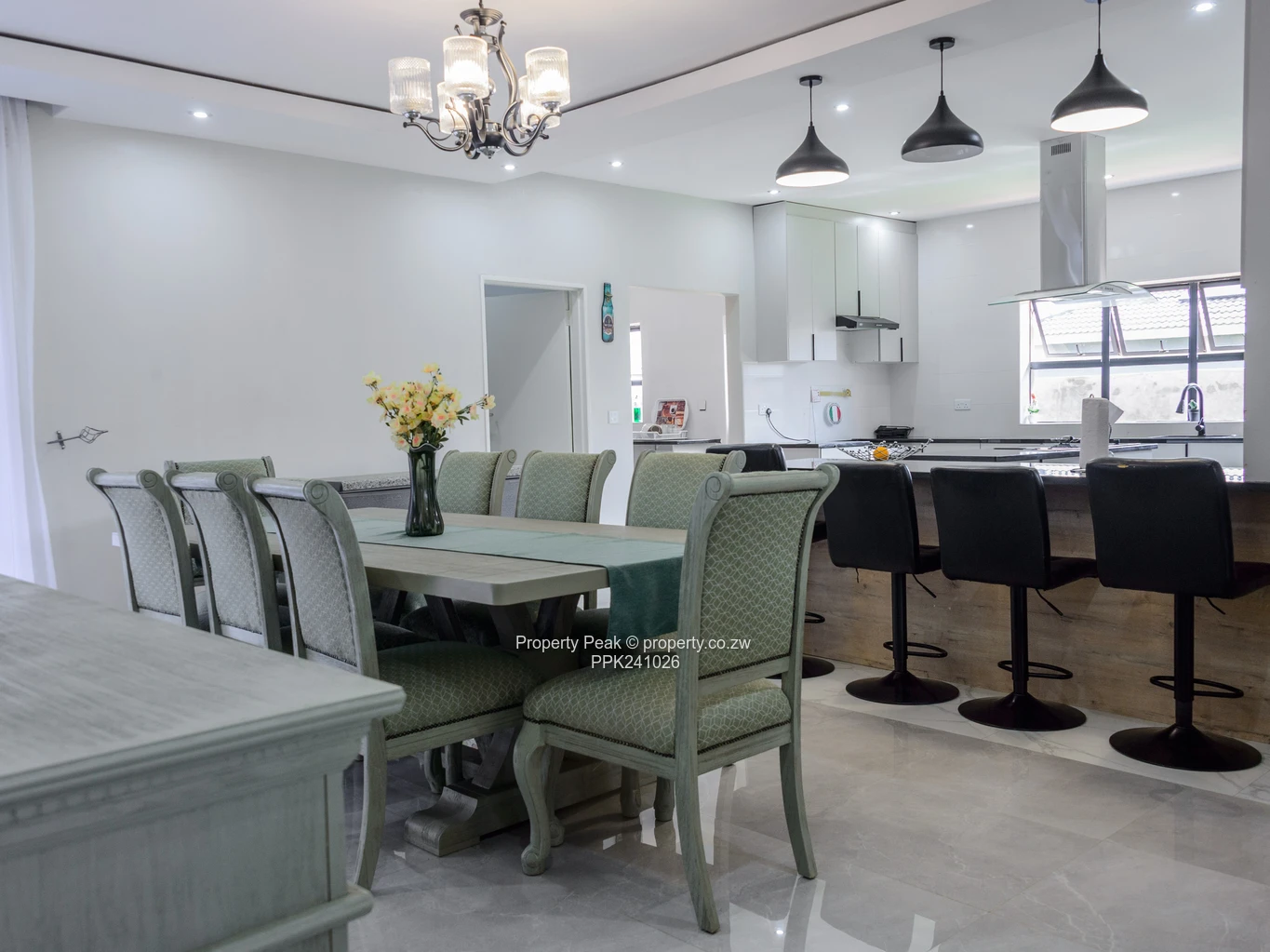 Stunning modern family home in New Marlborough, Harare West — 4 bedrooms, 4 bathrooms on a generous 1,992 m² stand with 400 m² of finished living space. Arrive through a secure walled property and gated drive to ample parking and a neat lawn (aerial shots show room for further landscaping or pool). The single-storey layout features a bright, tiled open-plan lounge and formal sitting area with elegant chandeliers and TV wall — perfect for entertaining. The contemporary kitchen is fitted with sleek cabinetry, a large island/breakfast bar and pendant lighting, plus a separate dining area. Bedrooms are spacious with good natural light and comfortable dressing/wardrobe space; bathrooms are fully tiled with modern fittings and glass shower enclosures. There is a beautiful and spacious double locked up garage, while an elevated water tank and borehole pump provide reliable water supply. Finished in neutral tones throughout, this home blends style, comfort and practicality — ideal for families seeking space, security and convenience in Harare West.
