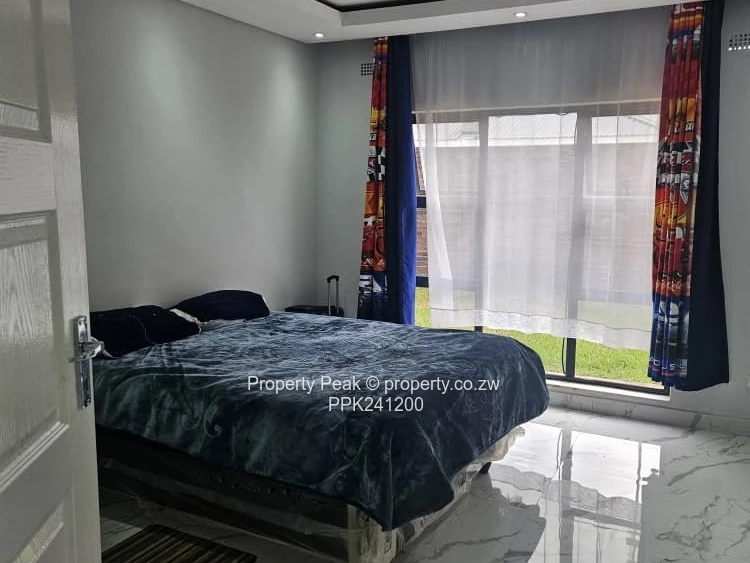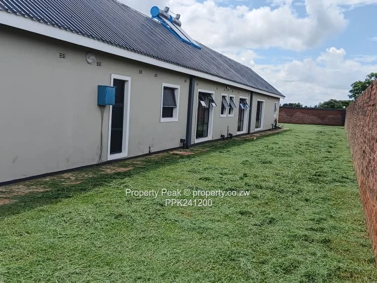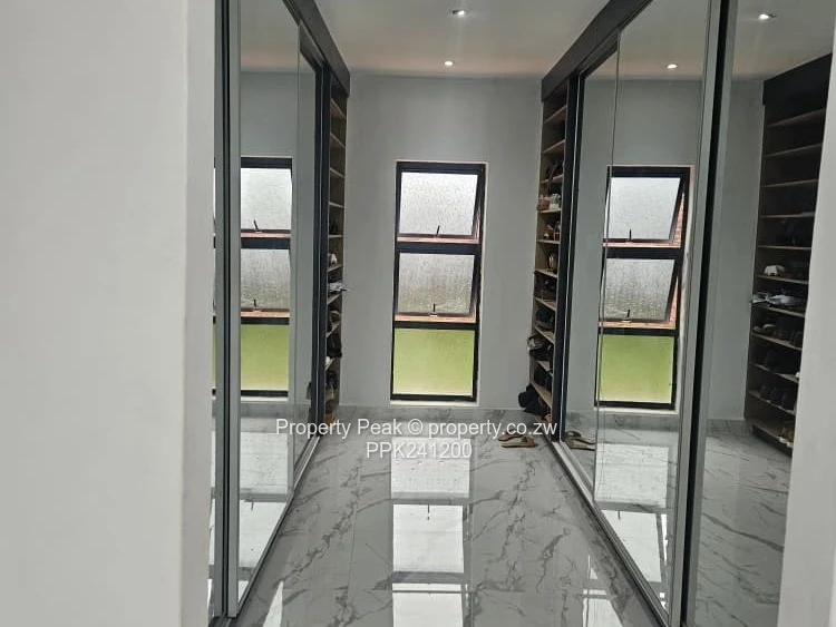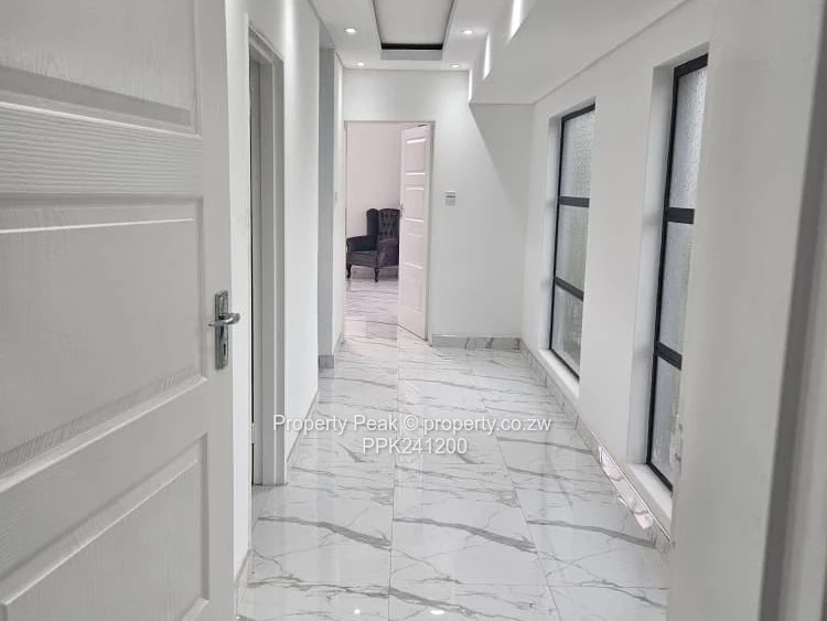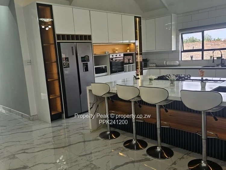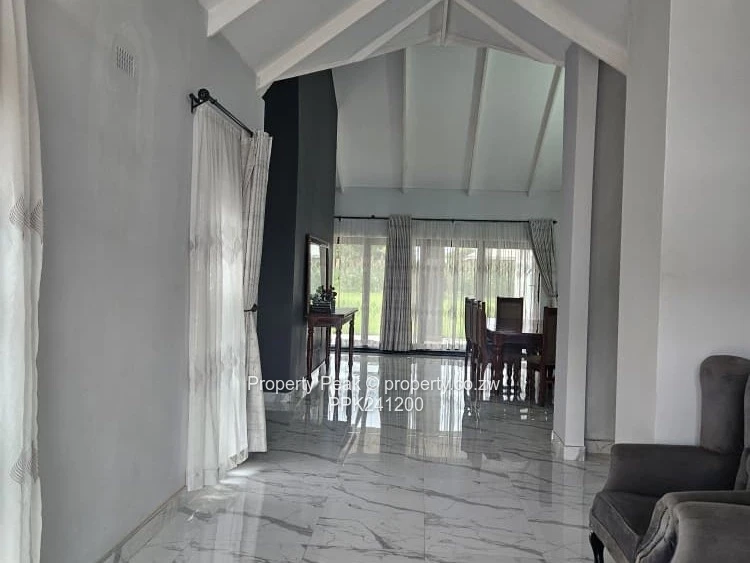 Stunning single-level family home in sought-after Mt Pleasant Heights, Harare West — 5 bedrooms, 5 bathrooms on a generous 2,200 m² stand with 400 m² of contemporary living space. The property greets you with a wide paved driveway and covered double carport, secure perimeter wall and a lush, well-kept lawn ideal for children and outdoor entertaining. Inside, bright open-plan living areas showcase high vaulted ceilings with exposed beams, glossy marble-style tiled floors and large windows and sliding doors that flood the space with natural light. The modern kitchen is a showpiece: island breakfast bar, sleek countertops and integrated cabinetry flowing into casual dining and formal lounge zones with tasteful feature walls. Several bedrooms open directly to the garden; the main suite offers space for seating and an ensuite with both shower and freestanding bath. Practical extras include built-in wardrobes, a long internal corridor with extra storage, and a borehole ensuring reliable water supply. This property blends refined finishes with family-friendly layout and excellent parking and outdoor space — perfect for entertaining and comfortable everyday living. Contact us today to arrange a viewing and experience this Mt Pleasant Heights home in person.