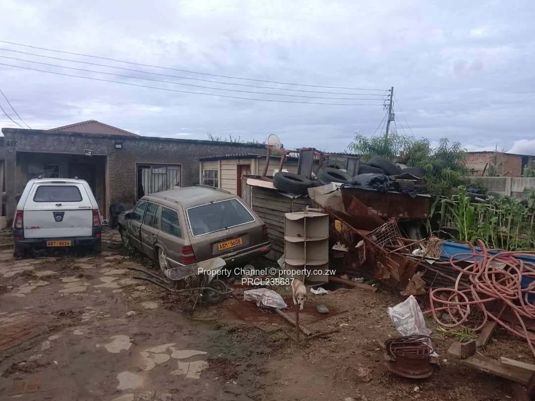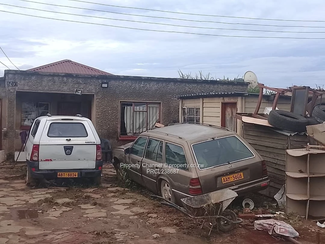 Solid investment opportunity in Granary Park, Harare High Density — a 2-bedroom, 1-bathroom single-storey house on a 300 m² stand with approximately 180 m² of built area. The property is fully walled for security and, as shown in the photos, features a covered porch entrance, tiled front step, exterior security lighting and burglar-barred windows. The front courtyard offers convenient off-street parking for two vehicles and currently stores additional vehicles and materials, so the yard will benefit from a clean-up to unlock its full potential.