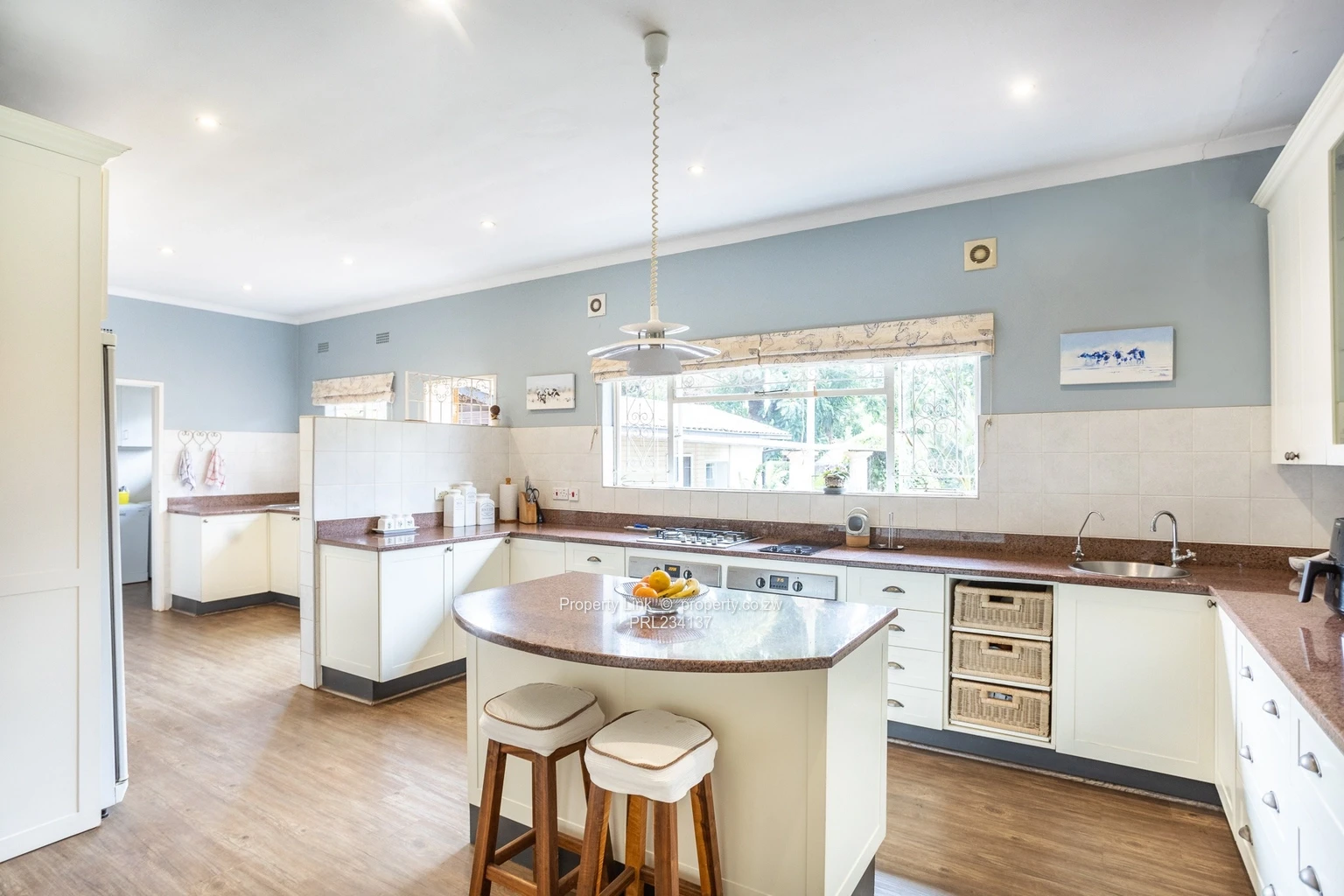 The modern kitchen has been thoughtfully upgraded with built-in cupboards, two fitted ovens, plus catering of both electric and gas hobs. Adjoining the kitchen is a scullery and pantry area, which houses the 6kVA solar inverter system and a large hand-wash laundry sink. A back door leads outside and on to a separate external laundry room, adjoining the prefabricated storage shed and a workshop.