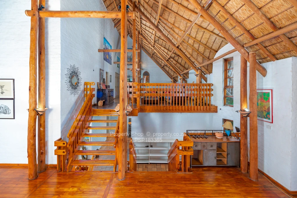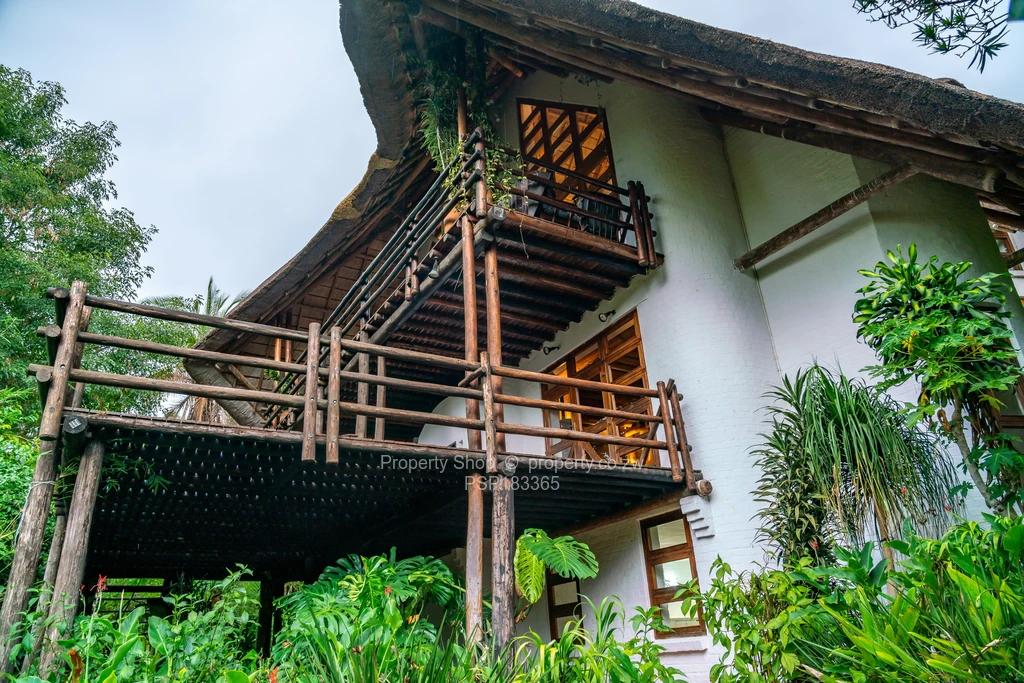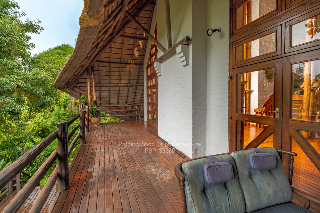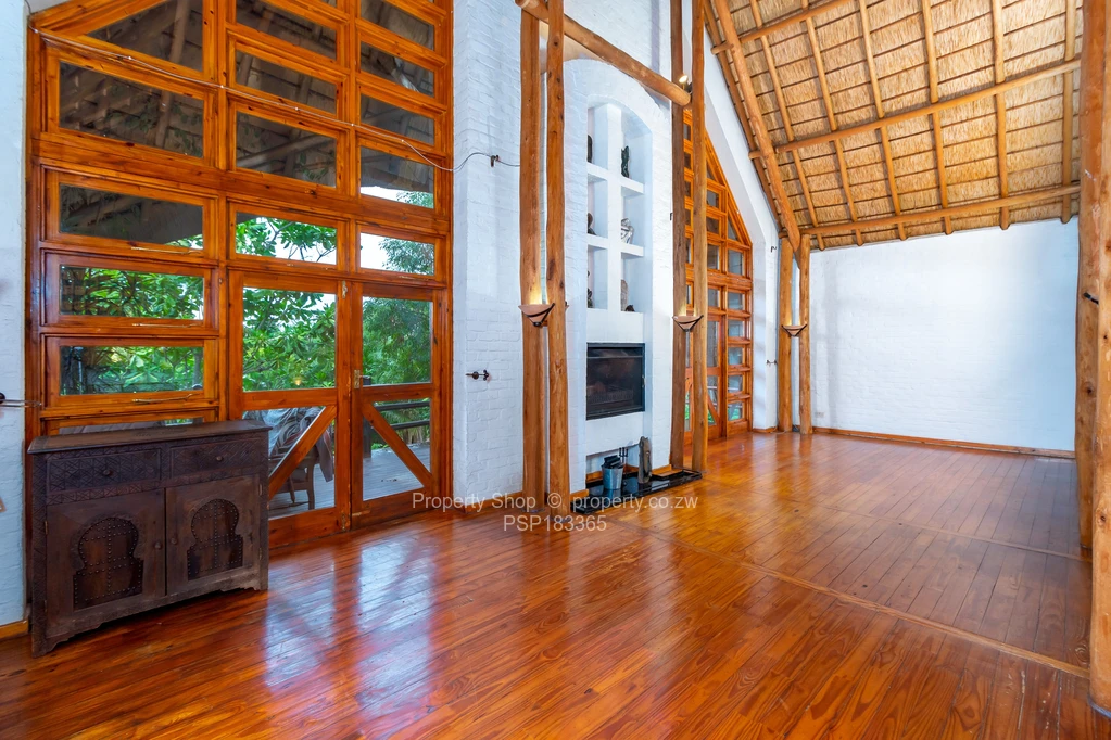 Sitting on 15acres of trees and mature garden is this stunning estate, with a beautiful 4 bedroomed split level thatch house. The house consist of 2 bedrooms with shared bathroom on the ground floor, open plan dining room ,tv room, kitchen and master bedroom are also situated on the top floor. Lower level, is a spacious entertainment area with a large balcony overlooking the garden and glitter stone swimming pool. This gem also offers a separate 1 bed flatlet in the basement with own private entrance and drive way.