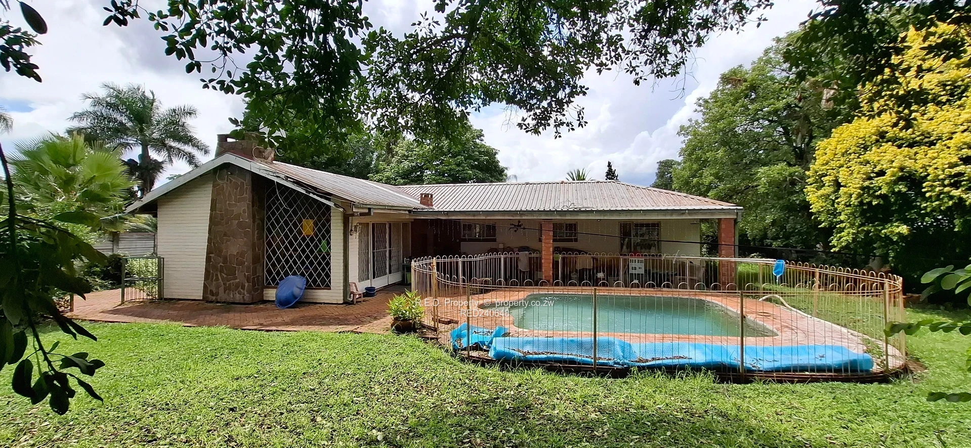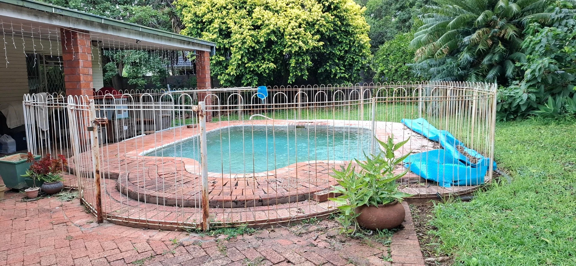 The home includes a fitted kitchen, a lounge with a working fireplace, and a separate dining room. A verandah with a built-in gas braai overlooks the working swimming pool – perfect for future entertaining once refreshed.