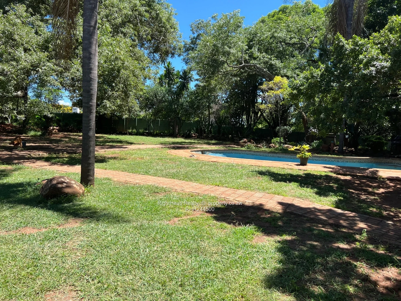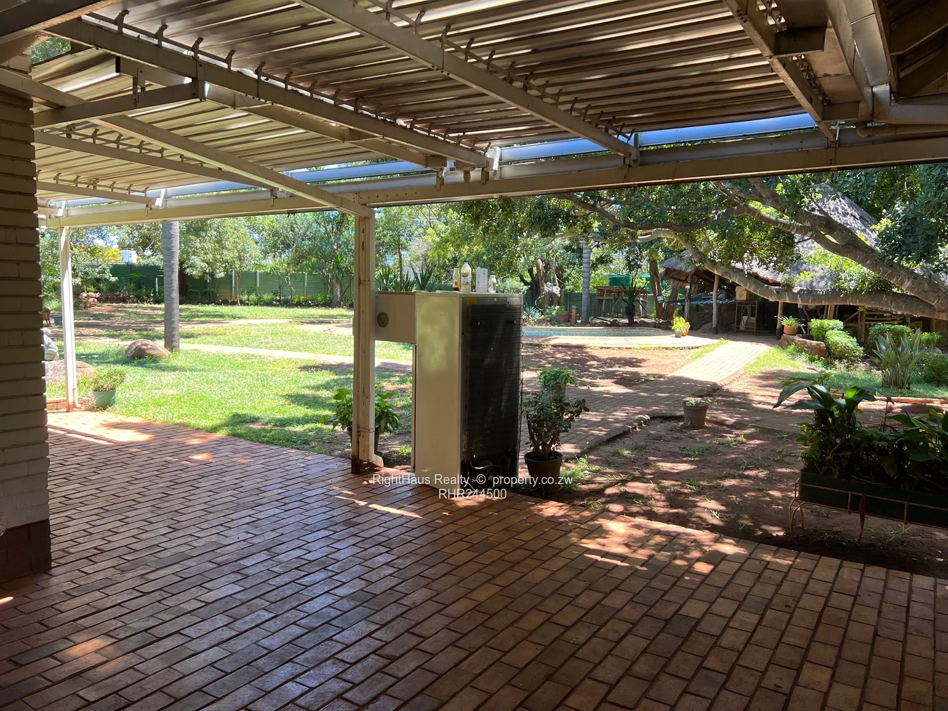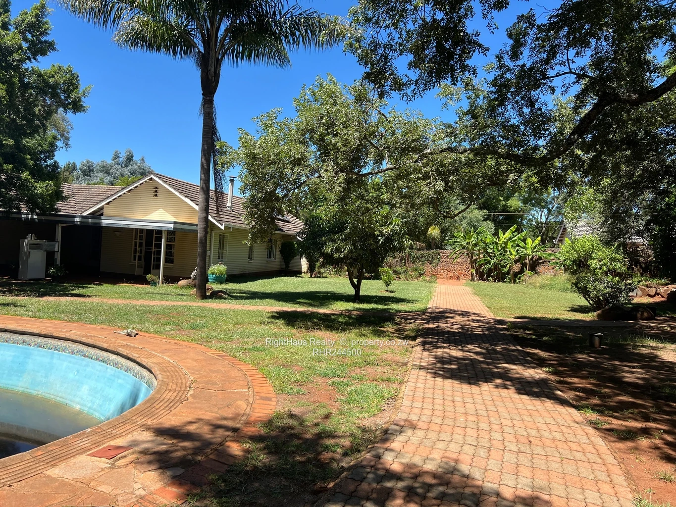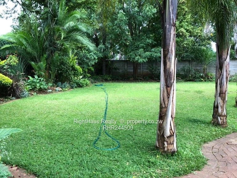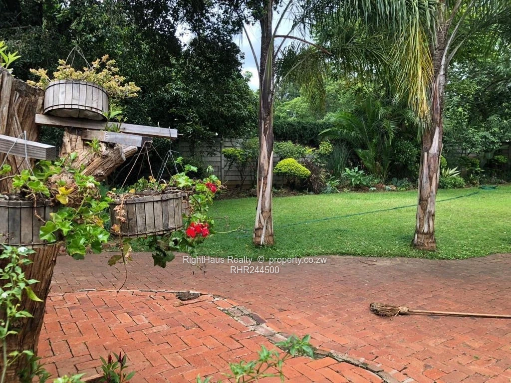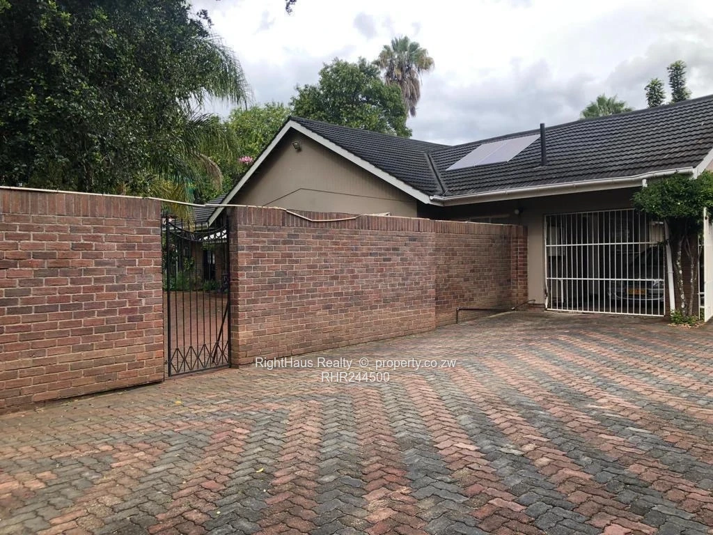Spacious family home in sought-after Alexandra Park, Harare North — 4 bedrooms, 3 bathrooms on a generous 2,300 m² stand with approximately 800 m² of building. The property greets you with a secure high brick perimeter wall and gated entrance leading to a wide interlocking driveway and covered parking (photo shows a locked garage/carport and brick paving). The single-level house features a tiled roof with a solar panel visible, sturdy security gates and window burglar bars, and classic metal awnings over large front windows that flood interiors with light. Mature palms and established garden beds surround a large, flat, manicured lawn ideal for children, pets or a future pool (photos show expansive green lawn and lush planting). A curved brick patio and paved entertaining areas connect house and garden, offering privacy and excellent outdoor flow. This is a well-located family property with strong curb appeal and potential to modernise to suit contemporary living.