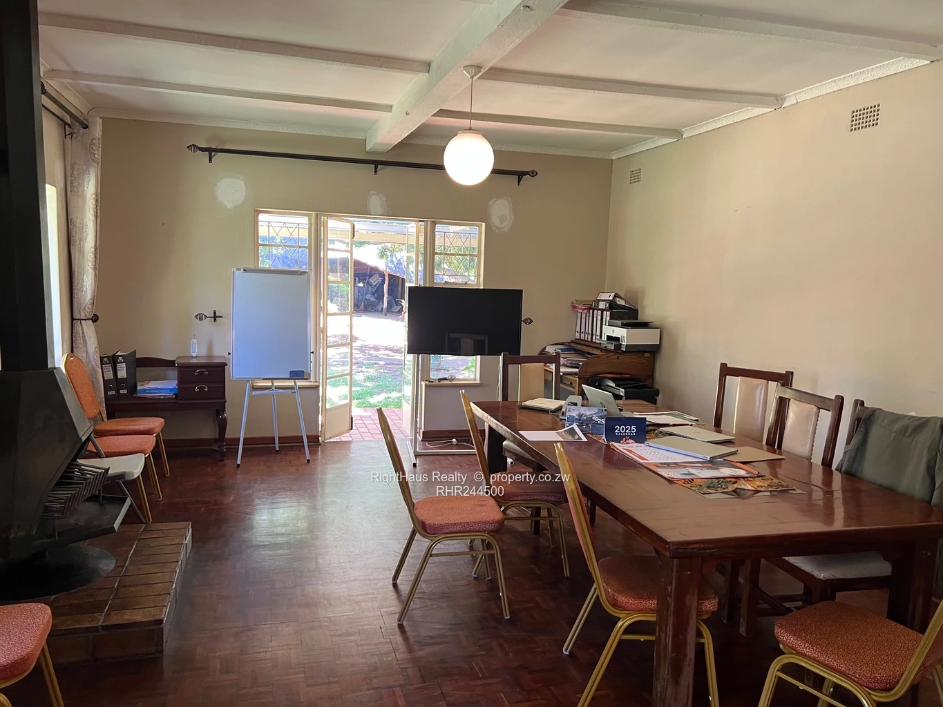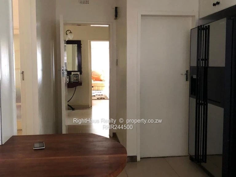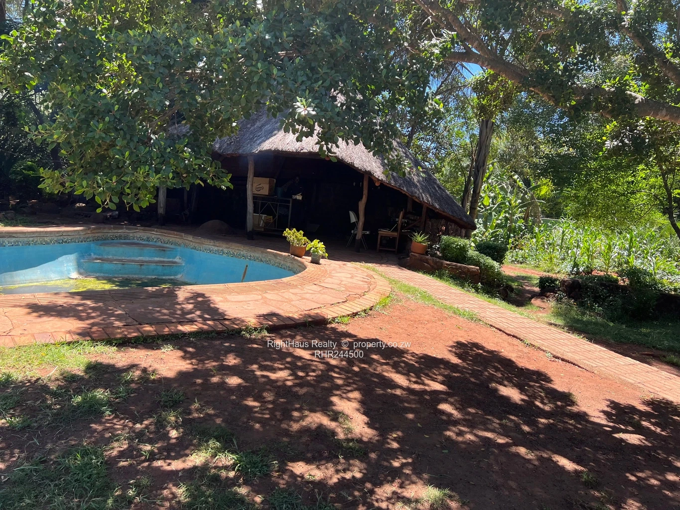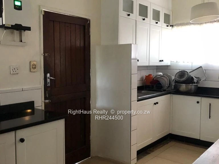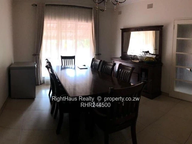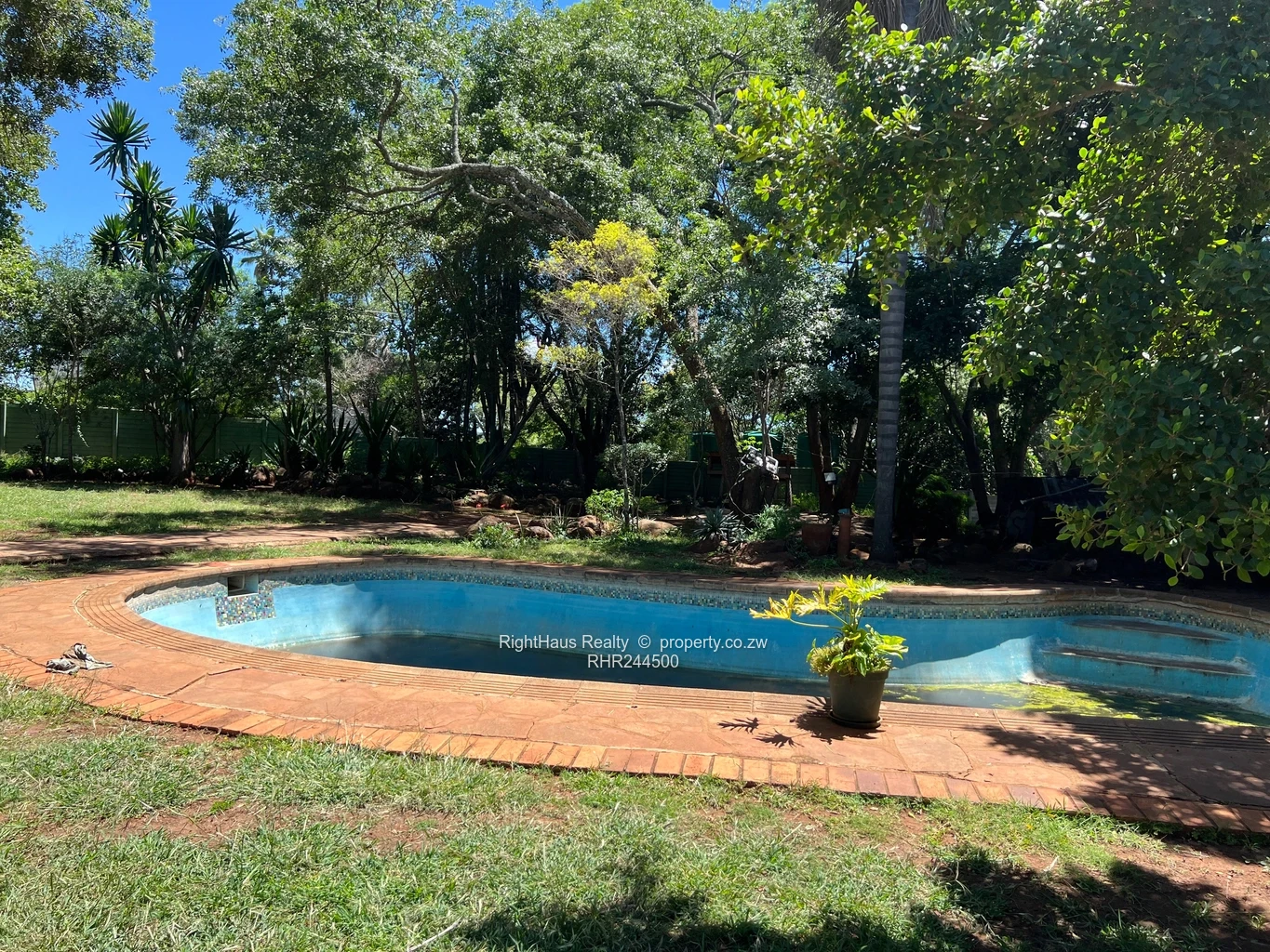Spacious family home in sought-after Alexandra Park, Harare North — 4 bedrooms, 3 bathrooms on a generous 2,300 m² stand with approximately 800 m² of building. The property greets you with a secure high brick perimeter wall and gated entrance leading to a wide interlocking driveway and covered parking (photo shows a locked garage/carport and brick paving). The single-level house features a tiled roof with a solar panel visible, sturdy security gates and window burglar bars, and classic metal awnings over large front windows that flood interiors with light. Mature palms and established garden beds surround a large, flat, manicured lawn ideal for children, pets or a future pool (photos show expansive green lawn and lush planting). A curved brick patio and paved entertaining areas connect house and garden, offering privacy and excellent outdoor flow. This is a well-located family property with strong curb appeal and potential to modernise to suit contemporary living.