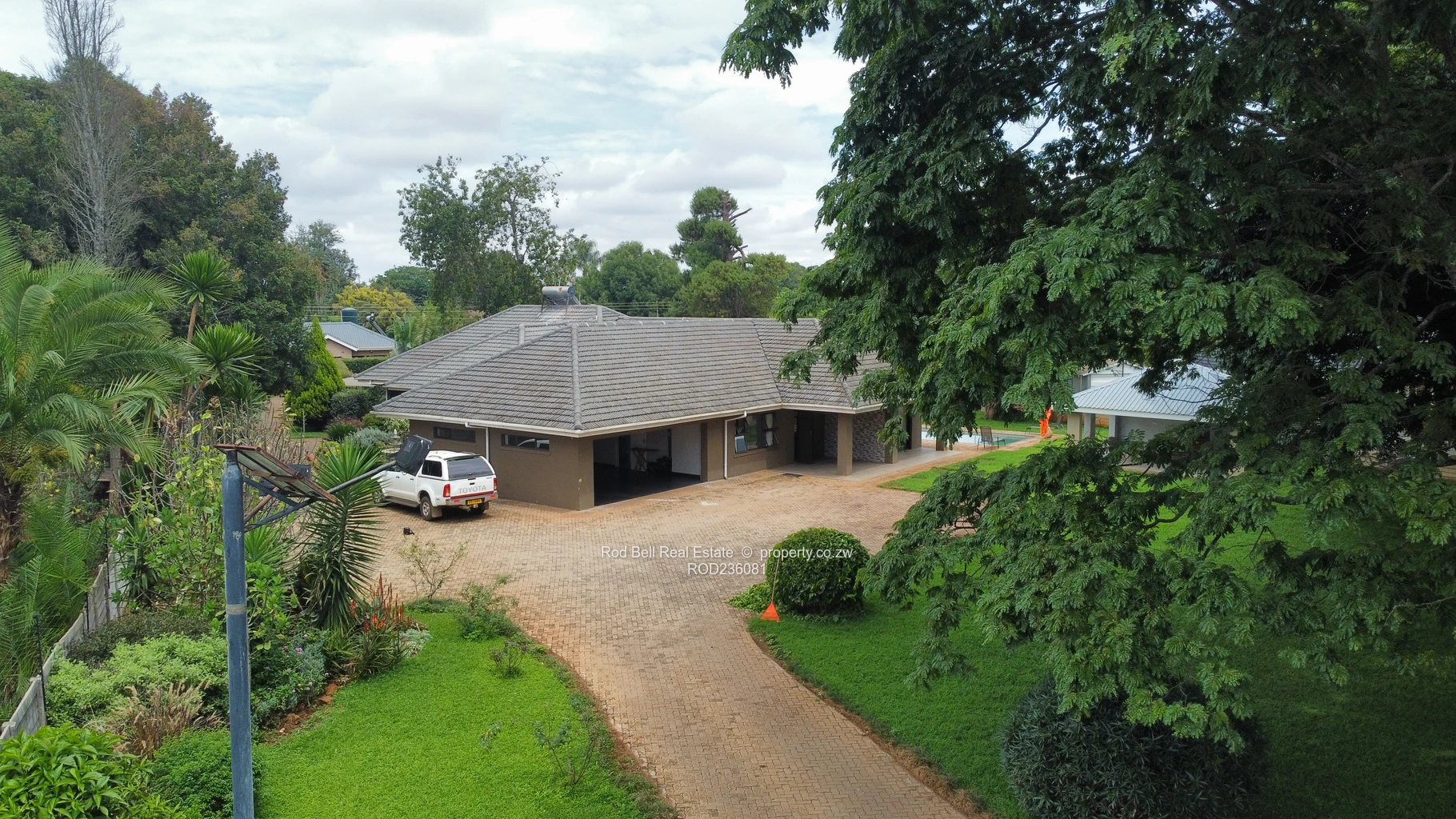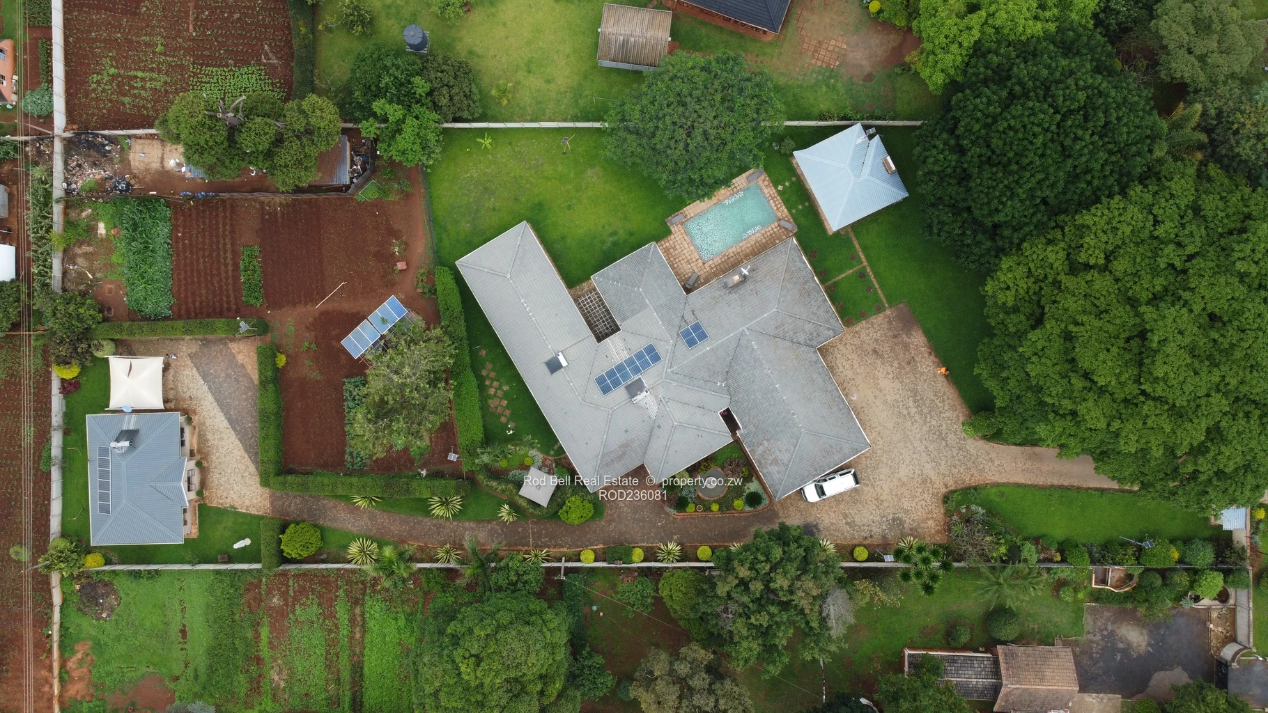 This modern and spacious home comprises of 6 bedrooms, 4 bathrooms, 3 ensuite, 2 lounges, separate dining room, large kitchen with scullery and laundry. The main bedroom has a large walk-in wardrobe. The double lock up garage leads from the main house. There is an entertainment area with a bathroom which allows access to people wanting to use the pool and avoiding the main house. At the back of the property there is a 3-bedroom cottage with an open plan lounge / kitchen, 2 bathrooms, 1 being ensuite. There is a lovely well-established garden and vegetable garden which is serviced by a good borehole, which is solar powered and 10000l water storage. The whole property is walled with an electric fence and electric gate.