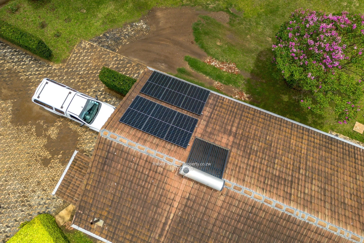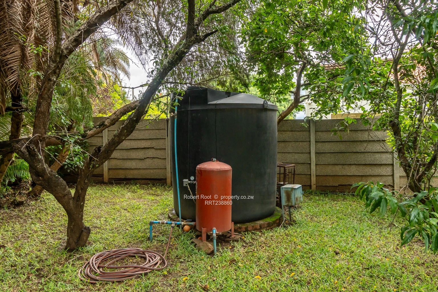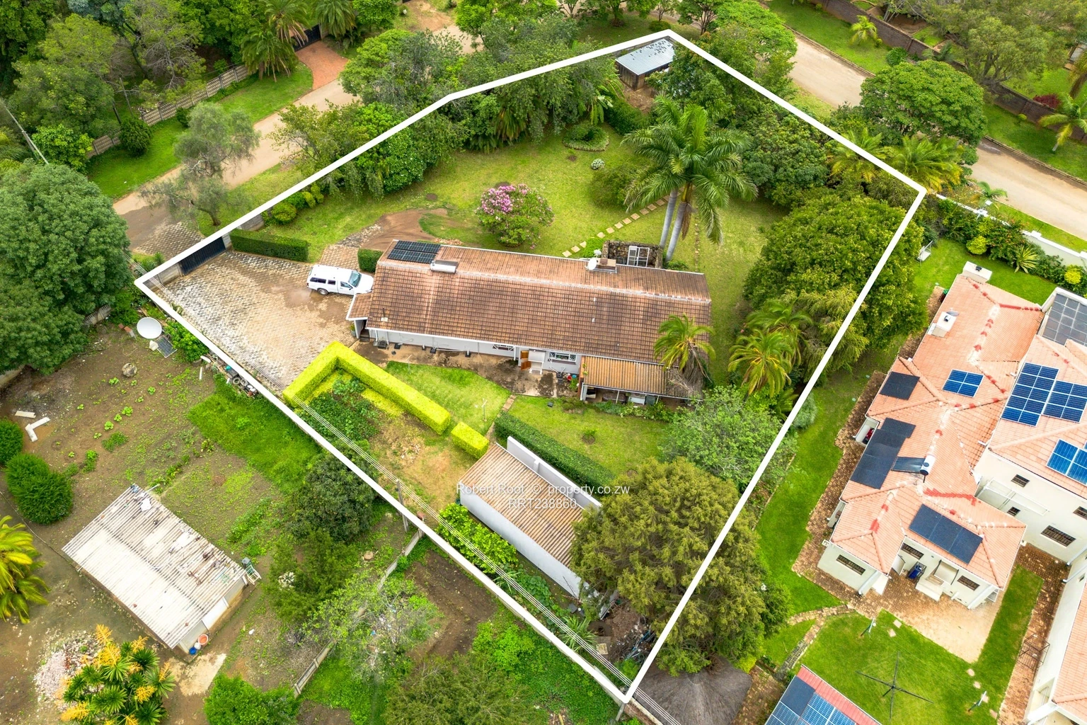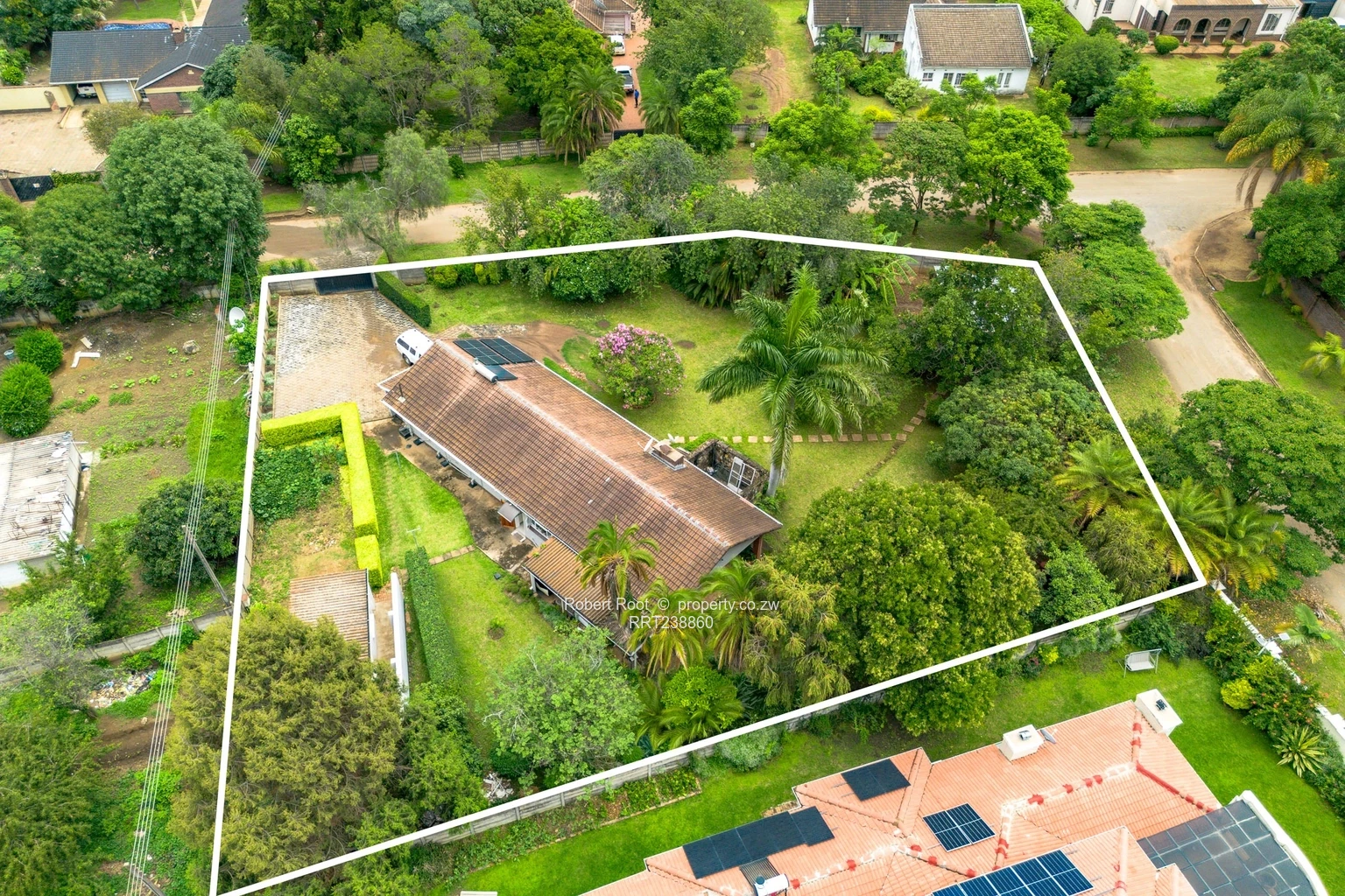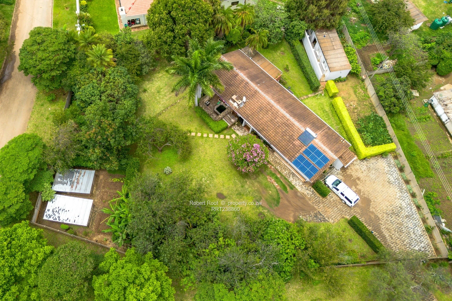 Charming family home in Vainona, Harare North — spacious, private and ready to enjoy. Set on a generous 2,090 m² erf with a 500 m² building footprint, this single-storey residence offers three comfortable bedrooms and two bathrooms, ample living space and excellent indoor/outdoor flow. As shown in the photos, the property benefits from reliable water with a borehole and visible holding tanks, plus solar panels on the roof to reduce electricity costs. Interiors include a large, well-equipped kitchen with plenty of cupboards and cooking space, a bright open-plan lounge/dining area with a character fireplace, and room for a home office or gym. The main bathroom features a full bath and separate shower, while bedrooms are generous with built-in storage. Outside you’ll find a lush, private garden with mature palms and lawns, a covered veranda/gazebo perfect for entertaining, a paved driveway with secure parking and a separate outbuilding that can serve as staff quarters, workshop or additional storage. Aerial photos clearly show the established, fenced plot and excellent neighbourhood setting. Ideal for family living or renovation into a bespoke entertainer’s home — contact us today to arrange a viewing.