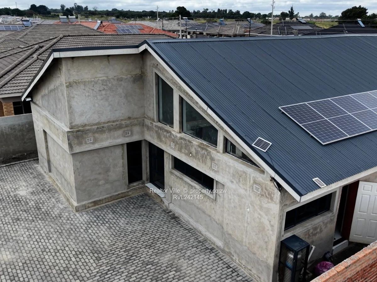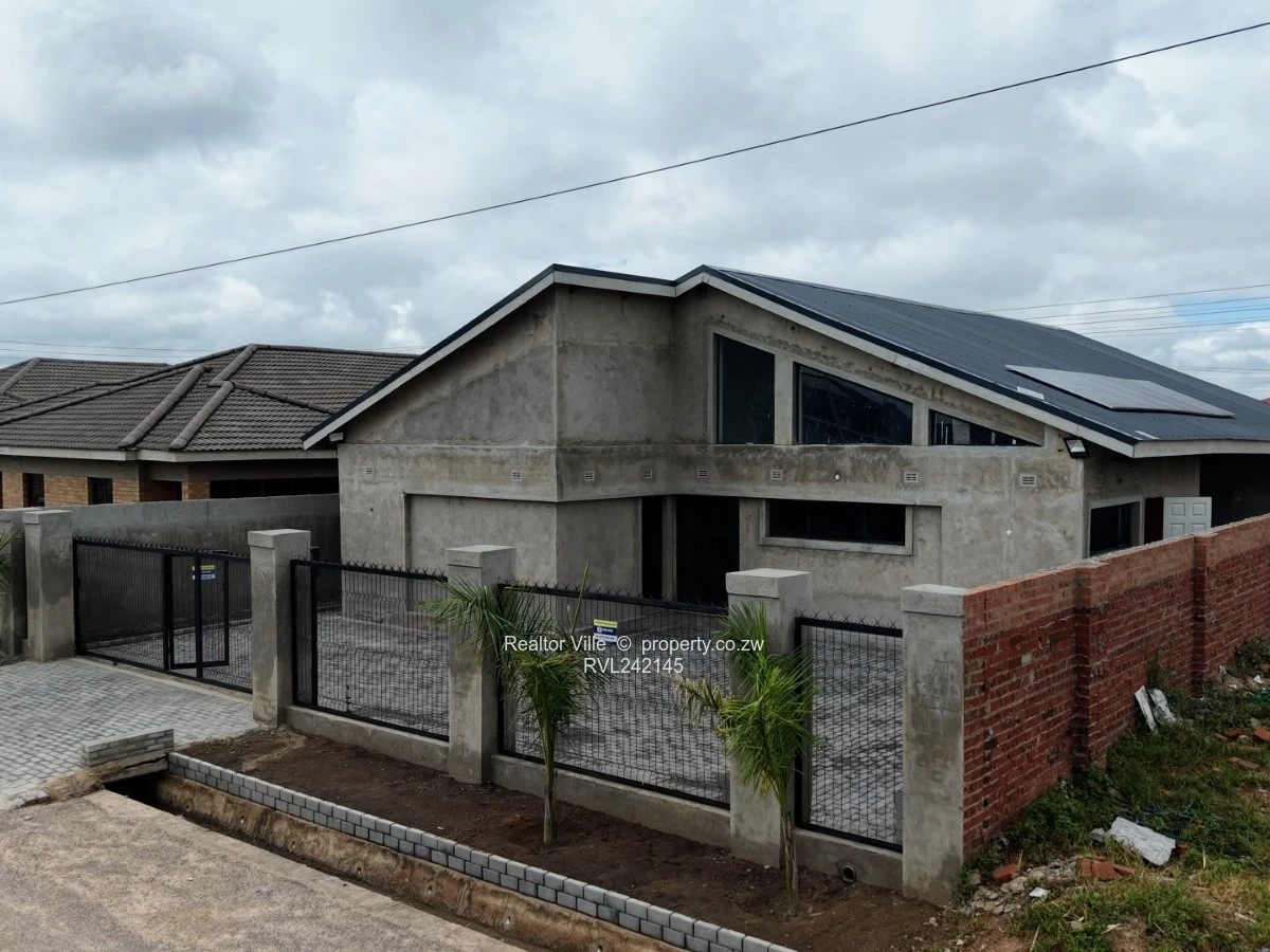 Modern, secure three-bedroom family home in Mabvazuva, Ruwa — ready for your finishing touches and immediate occupancy. Set on a compact 400 m² stand with a 140 m² footprint, this contemporary property offers 3 bedrooms and 2 bathrooms, a full borehole for reliable water supply and visible solar panels on the steel roof to reduce running costs.