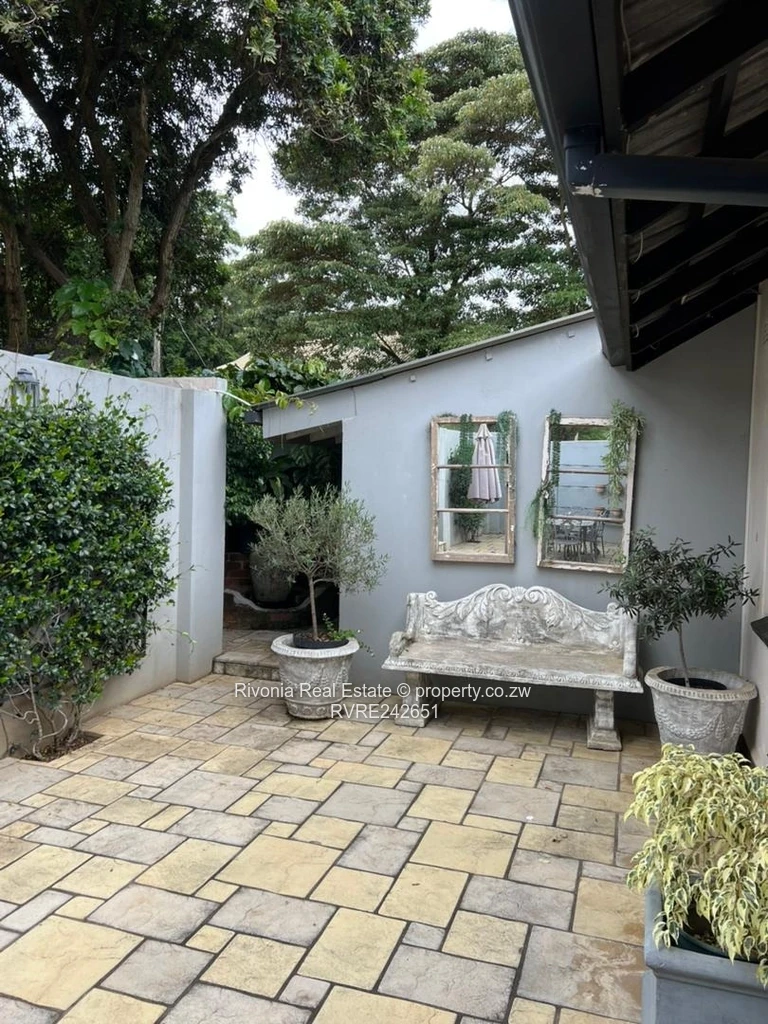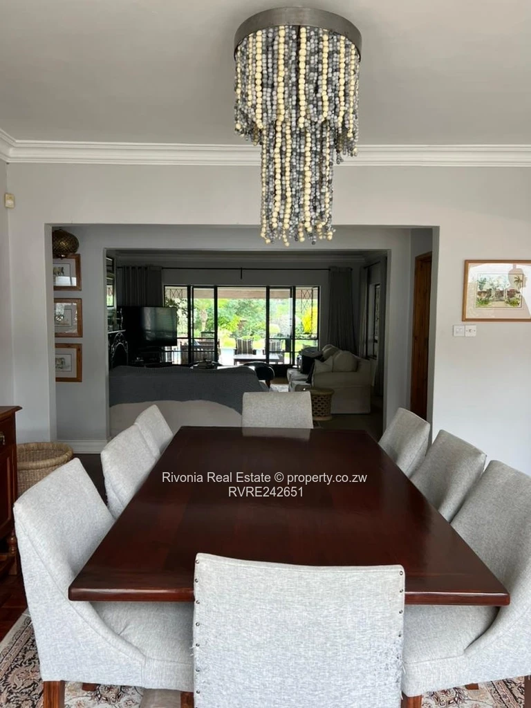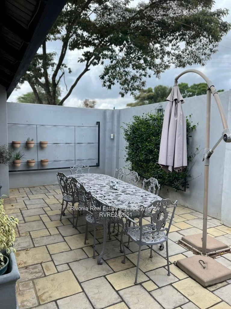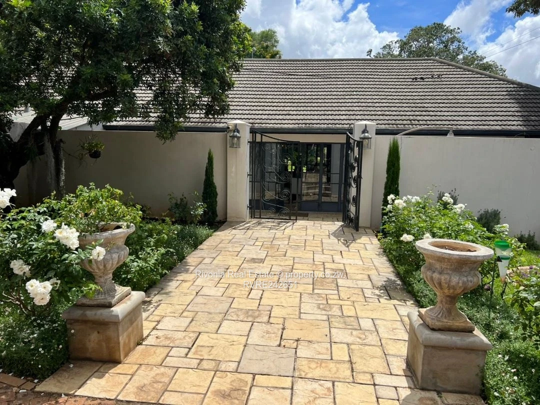 A gracious family home in Highlands, Harare North, set on a generous 4,085 m² plot with 600 m² under roof — this classic single-level residence combines relaxed indoor living with beautifully landscaped outdoor spaces. The paved stone entrance and formal walkway (pictured) lead into a light, airy layout of four spacious bedrooms and four bathrooms. The principal suite features a tranquil, tastefully dressed bedroom with an en-suite (shown), while living areas open onto a wide covered veranda framed by brick pillars and mature lawn — perfect for summer entertaining. A private paved courtyard with elegant outdoor dining (seen) creates an intimate spot for breakfasts and sundowners. Outside, the sparkling swimming pool and generous garden areas offer space for play and leisure, and a reliable borehole provides water security. With polished finishes, mature trees, secure perimeter walls and thoughtful indoor-outdoor flow, this Highlands home is ideal for families seeking comfort, privacy and effortless entertaining. Contact to arrange a viewing.