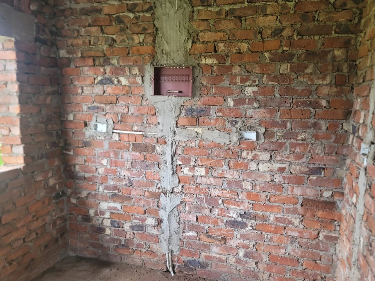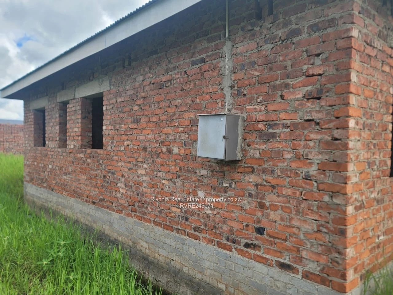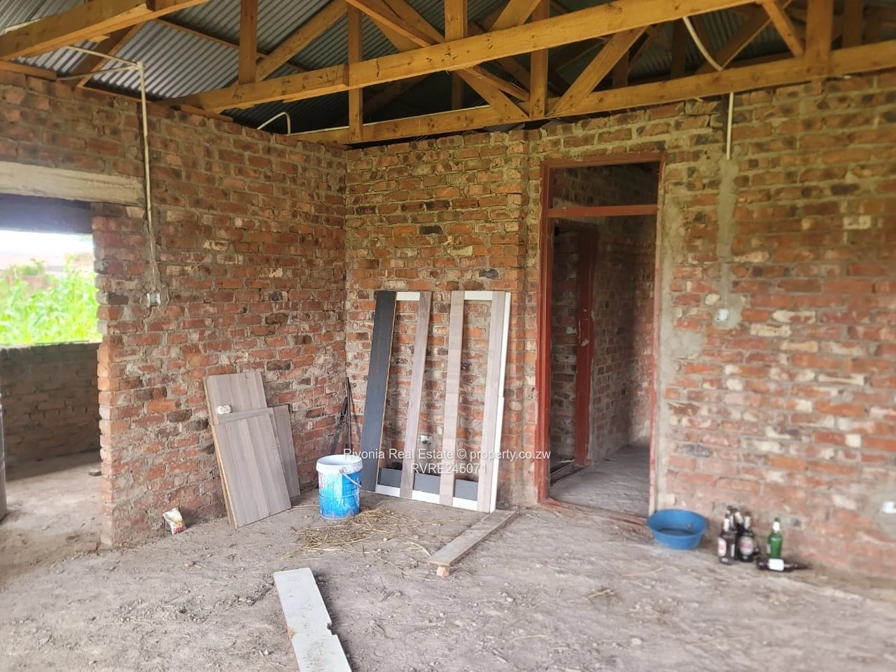 Unique opportunity in Sandton Park, Harare West — a 3-bedroom, 1-bath house on a generous 1,250 m² stand, offering 200 m² of built shell-ready space for you to finish to your taste. As shown in the photos, the property is at advanced shell stage with exposed brick walls, timber roof trusses and corrugated roof sheeting already in place. The covered front veranda with classical columns creates an inviting entrance and frames wide views over the large garden — perfect for landscaping, a vegetable patch, or adding a pool.