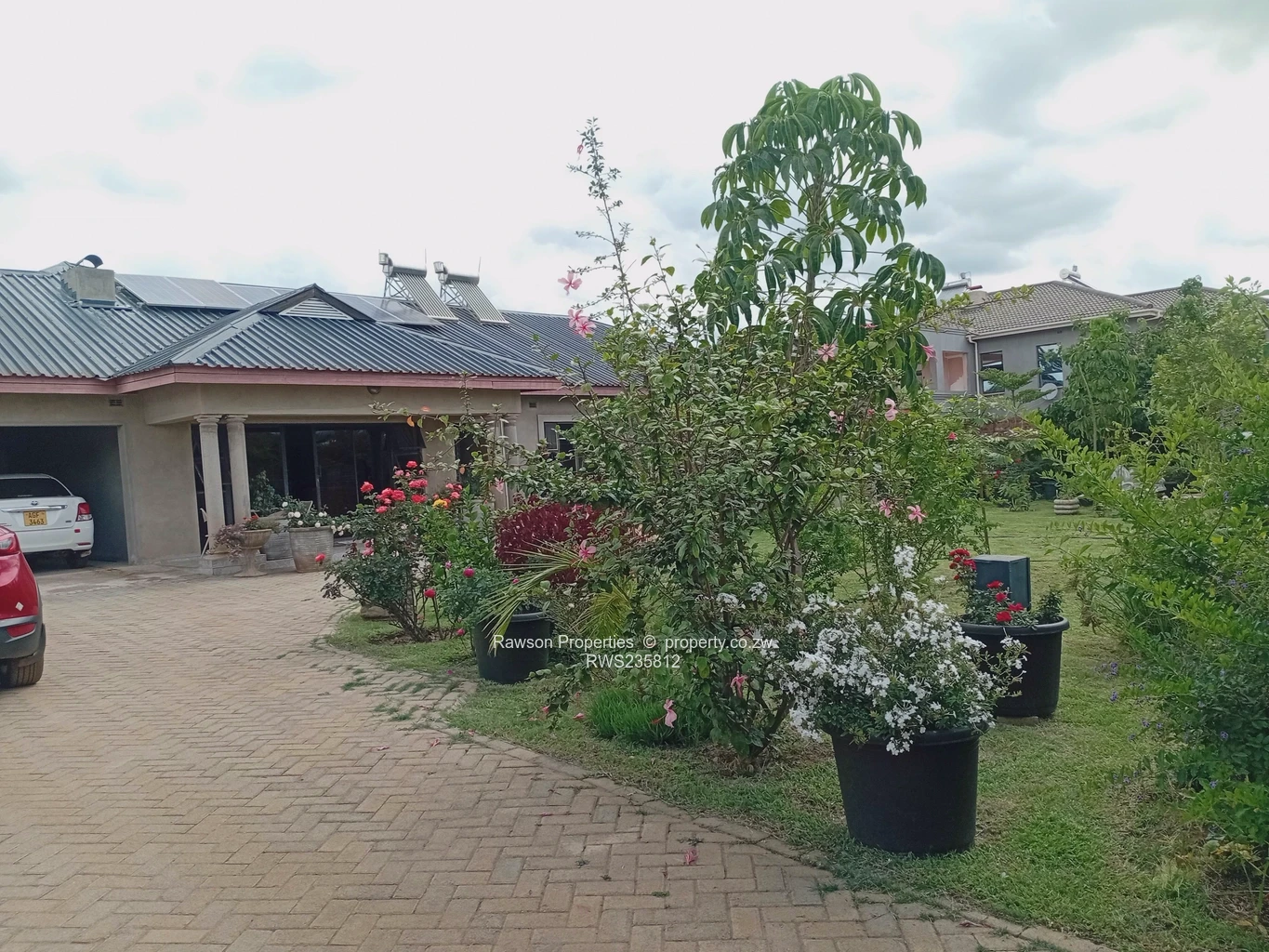 Beautiful family home in sought-after Borrowdale, Harare North — a spacious 5-bedroom, 3-bathroom house on a generous 2,000 m² stand with a comfortable 250 m² of living space. As seen in the photos, the property welcomes you with a wide paved driveway and covered parking for multiple vehicles, plus neat shrubbery and established garden beds that create privacy and curb appeal. The interior is bright and airy with tiled floors and abundant natural light through secure windows.