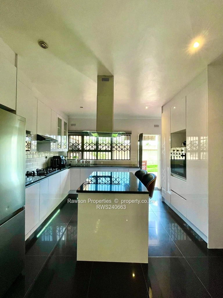 The home boasts a semi-open-plan kitchen, fitted with both four-plate ceramic and gas cooktops, a built-in oven, and dual extractors, all set against sleek black granite countertops. The adjoining scullery is equipped with a dual-basin sink, a spring mixer tap, and space for a washing machine, ensuring both style and practicality.