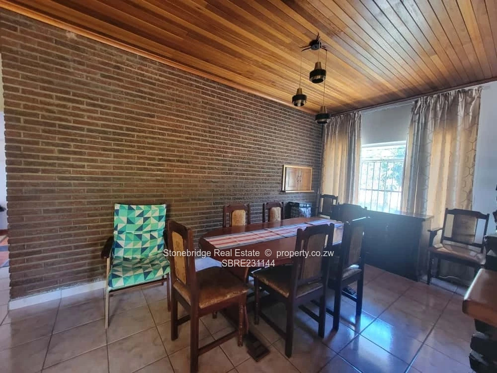 - Dining and lounge with pine-stripped ceiling and jet master fireplace