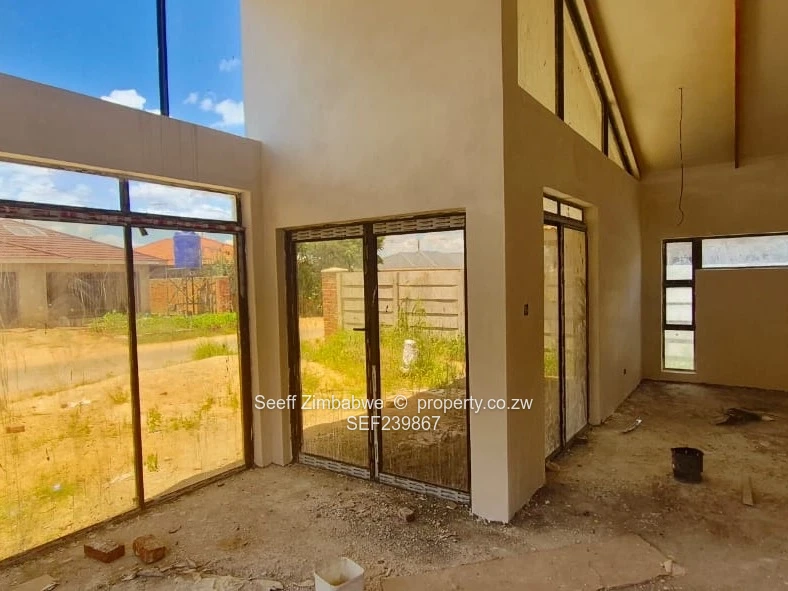 Contemporary 3-bedroom, 2-bath home in Southview Park, Harare South — a smart investment with character and great upside. Sited on 240 m² with a 140 m² footprint, this near-complete shell offers dramatic vaulted ceilings and a striking triangular clerestory of tinted glazing above the front elevation (as seen in the photos), flooding the open-plan living area with light. Sliding glass doors open to the front yard and street, creating easy indoor–outdoor flow and excellent curb appeal.