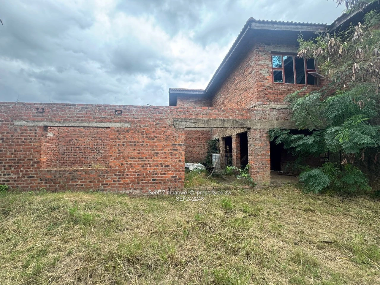A rare opportunity in Knowe, Norton — a substantial double-storey family home on a generous 1,775 m² stand, offered as a solid shell ready for completion and custom finishing. As seen in the photos, the red-brick structure features a dramatic curved upper verandah supported by robust columns, wide ground-floor covered patio, and large window openings that promise abundant natural light. The building footprint currently provides space for 5 bedrooms (including a main en-suite), 3 bathrooms, a flatlet/cottage and staff quarters — ideal for extended family or rental income. The property is fully walled for privacy, has a carport and separate garage, established garden with mature trees, municipal water connection plus an on-site water tank and sewer system, and good ZESA supply. Additional highlights include a fireplace, tiled finishes where completed and potential to craft elegant living areas and a reception-ready entrance. This is an exceptional blank canvas for a developer or owner-builder seeking a secure, spacious family estate in Mashonaland West — arrange a viewing today to explore the potential and begin your custom build.
