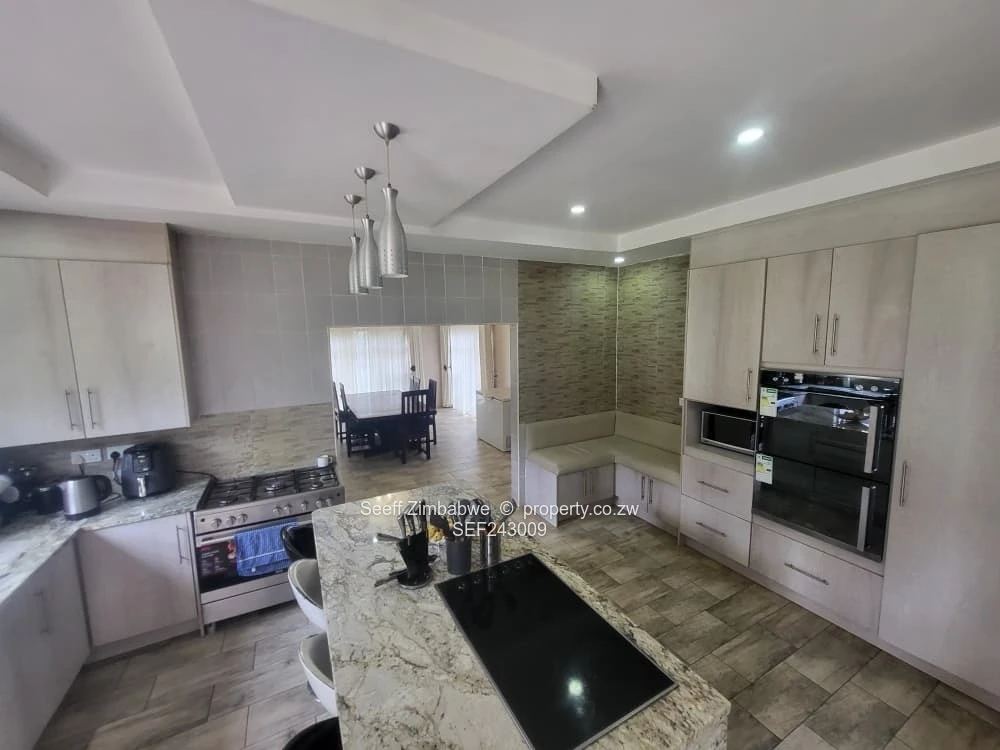 Immaculate 5-bedroom, 3-bathroom family home in sought-after Mandara, Harare East — sitting on a generous 4,869 m² stand with a comfortable 250 m² of well-appointed living space. The heart of the home is a contemporary open-plan kitchen featuring a large granite island/breakfast bar with stylish bar stools, modern built-in oven and range, tiled floors and a tasteful glass-tiled backsplash — perfect for entertaining. Bedrooms are spacious and bright: a sumptuous master with wood-effect flooring and ample natural light, plus well-sized secondary bedrooms finished with soft window treatments and neutral palettes. Bathrooms are modern and functional with tiled walls, frosted windows for privacy, glass shower enclosures, a separate bathtub and chic vanities with stone tops. Outside, the expansive grounds provide excellent scope for landscaping, a pool, or additional outbuildings — ideal for families or investors looking to develop. Reliable water supply is assured with an on-site borehole. Located in a peaceful residential pocket of Harare East with easy access to amenities, this property blends contemporary comfort with huge potential.