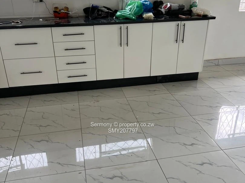 Open-plan kitchen with fitted built in cupboards and lounge for a cozy, contemporary feel.
