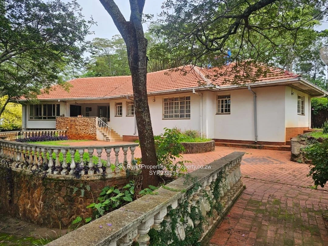The main house features three bedrooms, including a master bedroom with en-suite bathroom. Living spaces include a lounge, sitting area, dining area, and a balcony. Additional rooms include a study/office, fully fitted kitchen, pantry, scullery, laundry area, and ample linen cupboards. The home is serviced by a separate bathroom and toilet, as well as a combined bath and toilet.