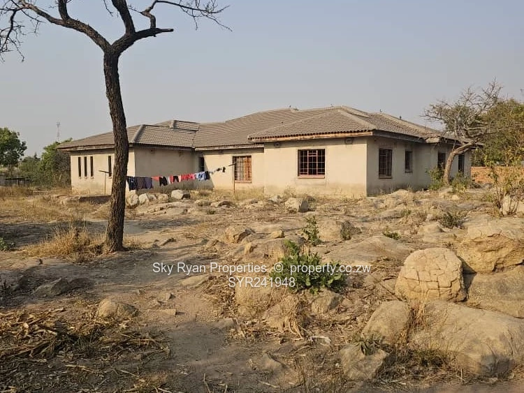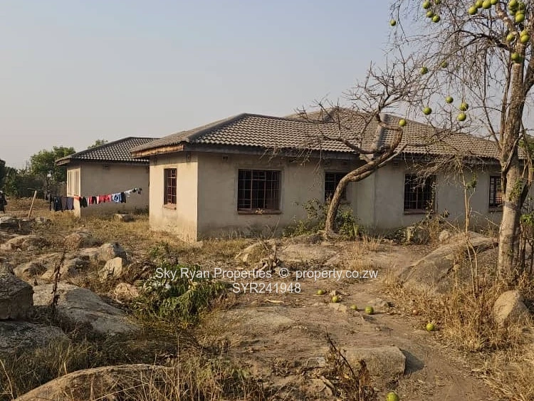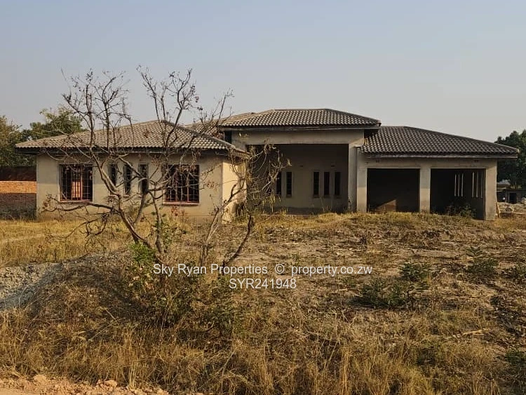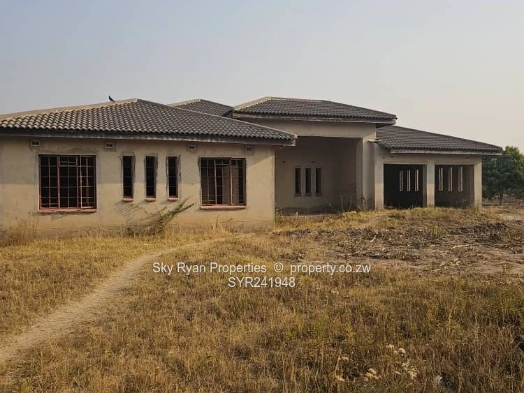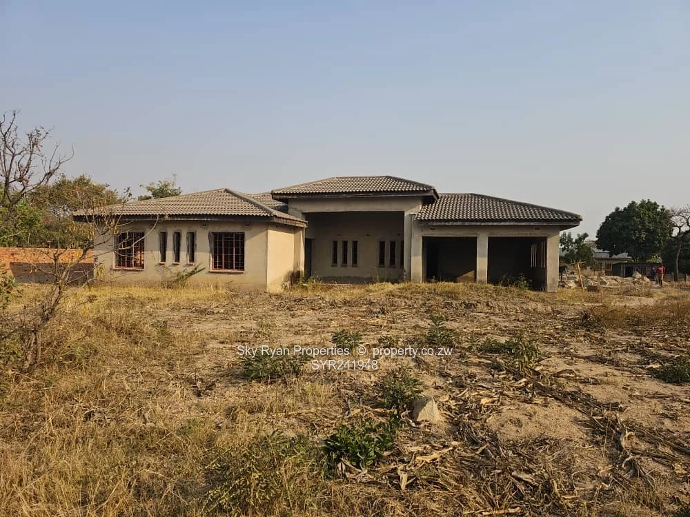 It's on 2600 sqmt the house has 4 bedrooms 2 with en suite 2 toilets with bathrooms combined kitchen and living/ dining, Scully,varenda , lockup garage for 2 cars, no ceiling, no floor, no window panes,no plumbing,no doors,380 sq meter floor area, orchard and roof leak on 2 spots