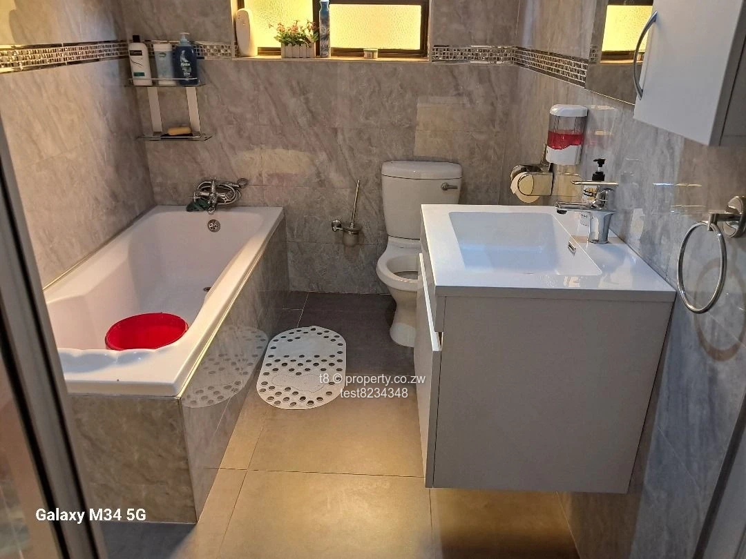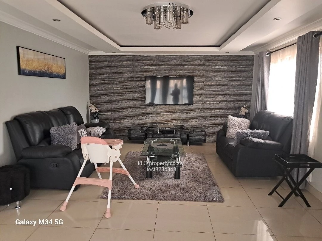 Modern family home in Marimba Park — solid, secure and move-in ready. This spacious 4-bedroom, 2-bathroom house sits on a 456 m² stand with 300 m² of well-laid living space. As seen in the photos, the property is fully walled with a gated paved driveway and garage, neat manicured shrubs to the front and plenty of off-street parking. The open-plan lounge and dining area is tiled throughout and features a cosy fireplace and large windows that flood the rooms with light. The fitted kitchen is a highlight — contemporary cabinetry, granite surfaces and an island/worktop perfect for family meals and entertaining. The main bedroom includes an en suite; bathrooms are modern and fully tiled. Practical extras include a raised water tank for reliable supply, municipal water connection, sewer system, and a secure side passage/utility area. Ideal for a growing family seeking comfort, security and convenience in Harare High Density. Arrange a viewing today to experience the quality and layout shown in the photos.