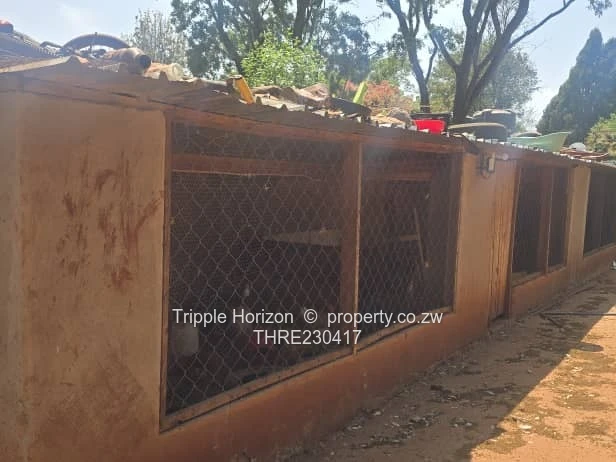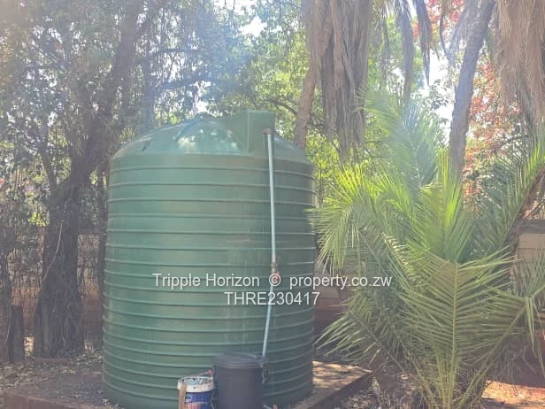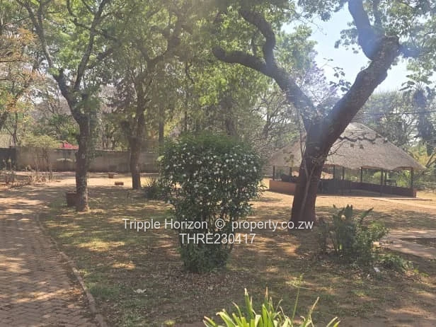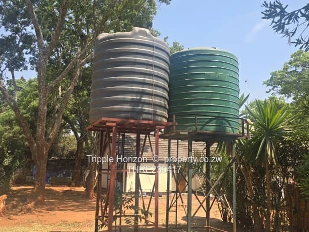 Practical conveniences include a fitted kitchen with ample cupboards, a separate storage room, staff quarters, garage and covered carport. The yard is fully walled and protected by an electric fence and electric gate with access control for added security. Borehole and municipal water is available plus large elevated water tanks for supply backup; solar panels on the roof and good ZESA supply support reliable power. Paved driveways and tiled floors throughout simplify maintenance. Additional on-site amenities include an aviary/kennel-type enclosure, paved entertainment courtyard and secure parking.