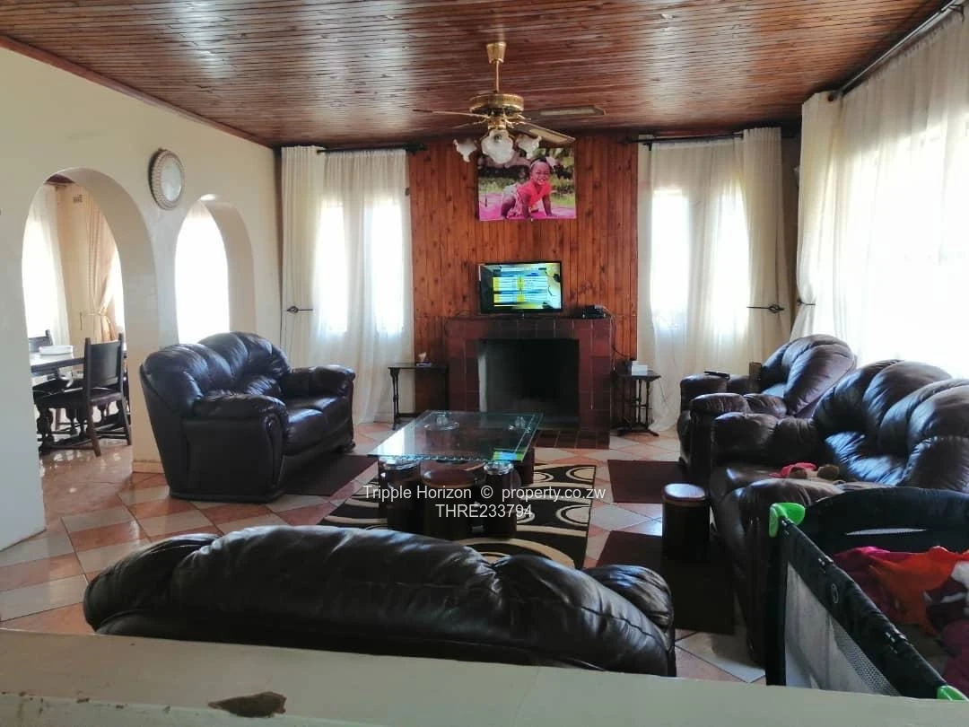 Charming 4-bedroom, 3-bathroom family home on a generous 2,600 m² stand in Norton Knowe, Mashonaland West — ideal for buyers seeking space, comfort and reliable water supply. The single-storey residence (410m²) presents a neat white exterior with a red-tiled roof and sheltered front verandah (photos show the welcoming façade and mature shrubs), perfect for morning coffee or watching kids play on the lawn. Inside, the living spaces are bright and airy with decorative ceilings and archways that add character (see lounge image with ceiling fan and large windows).
