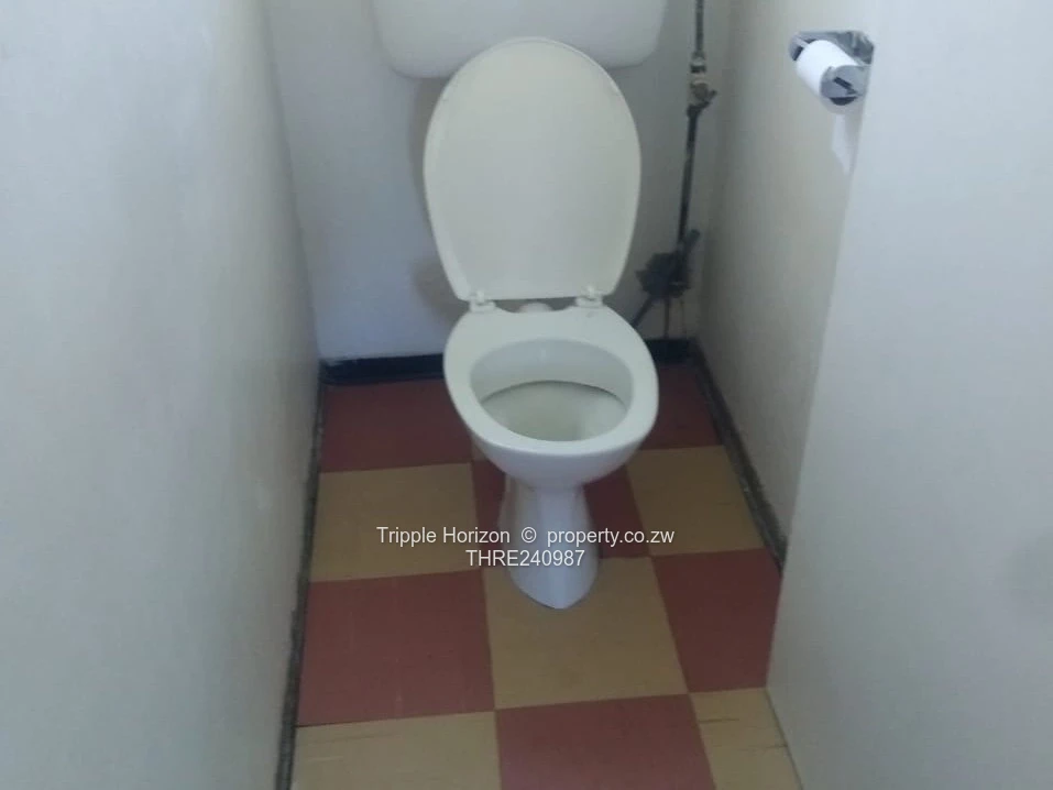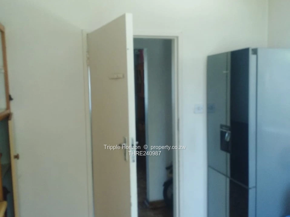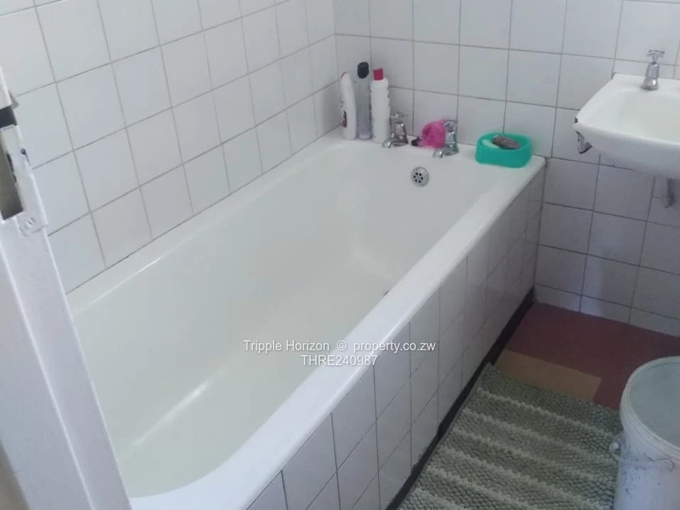 Inside, the house blends character and recent upgrades: a bright living area with marble-look tiled floors and contemporary curtains and light fittings, original parquet flooring in parts of the home, and a fitted kitchen with space for appliances (fridge pictured). The bathroom is fitted with a full bath and there is a separate toilet. The house is tiled throughout in key areas, connected to municipal water and a functioning sewer system, with reliable ZESA supply. Landscaped front flowerbed and paved outdoor space give scope for entertaining and parking.