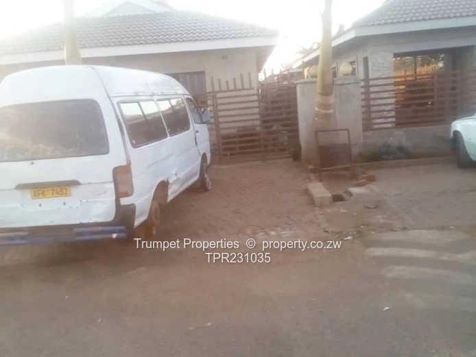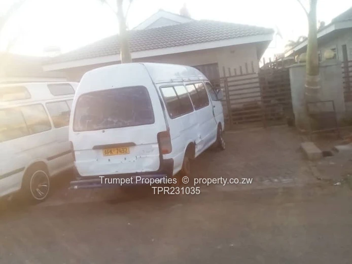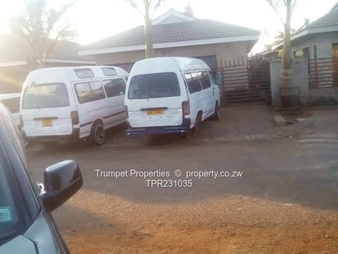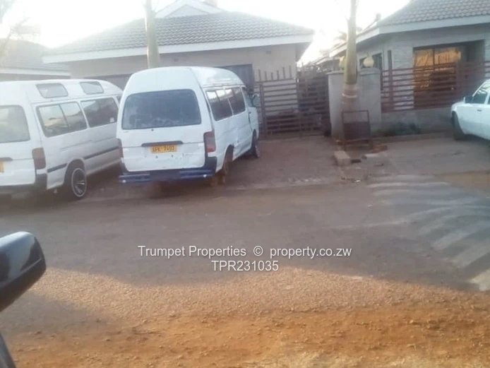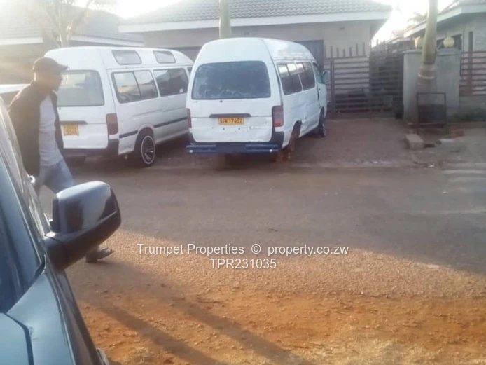 Photos show a paved front yard/driveway with space for multiple vehicles — currently accommodating minibuses — making this ideal for residents with extra cars or small business needs. Interior shots reveal neat tiled flooring and barred windows for added safety. Outside there is a tidy lawn and narrow garden strip running along the side of the house, offering pockets of green and space for container gardening or a small outdoor seating area.