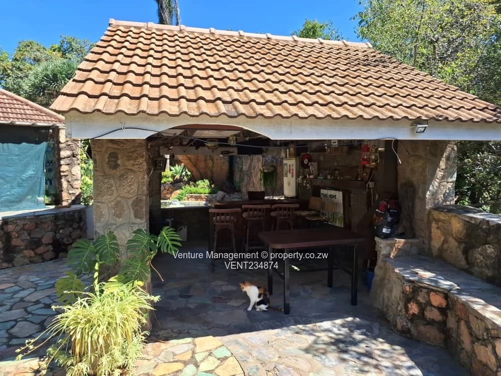Outdoor living is enhanced by a beautifully maintained garden, small pool, bar and entertainment area, and a paved yard, perfect for hosting gatherings or enjoying peaceful outdoor moments. Water supply is secured by an approximately 85-meter borehole, supported by two storage tanks, ensuring a reliable water supply.