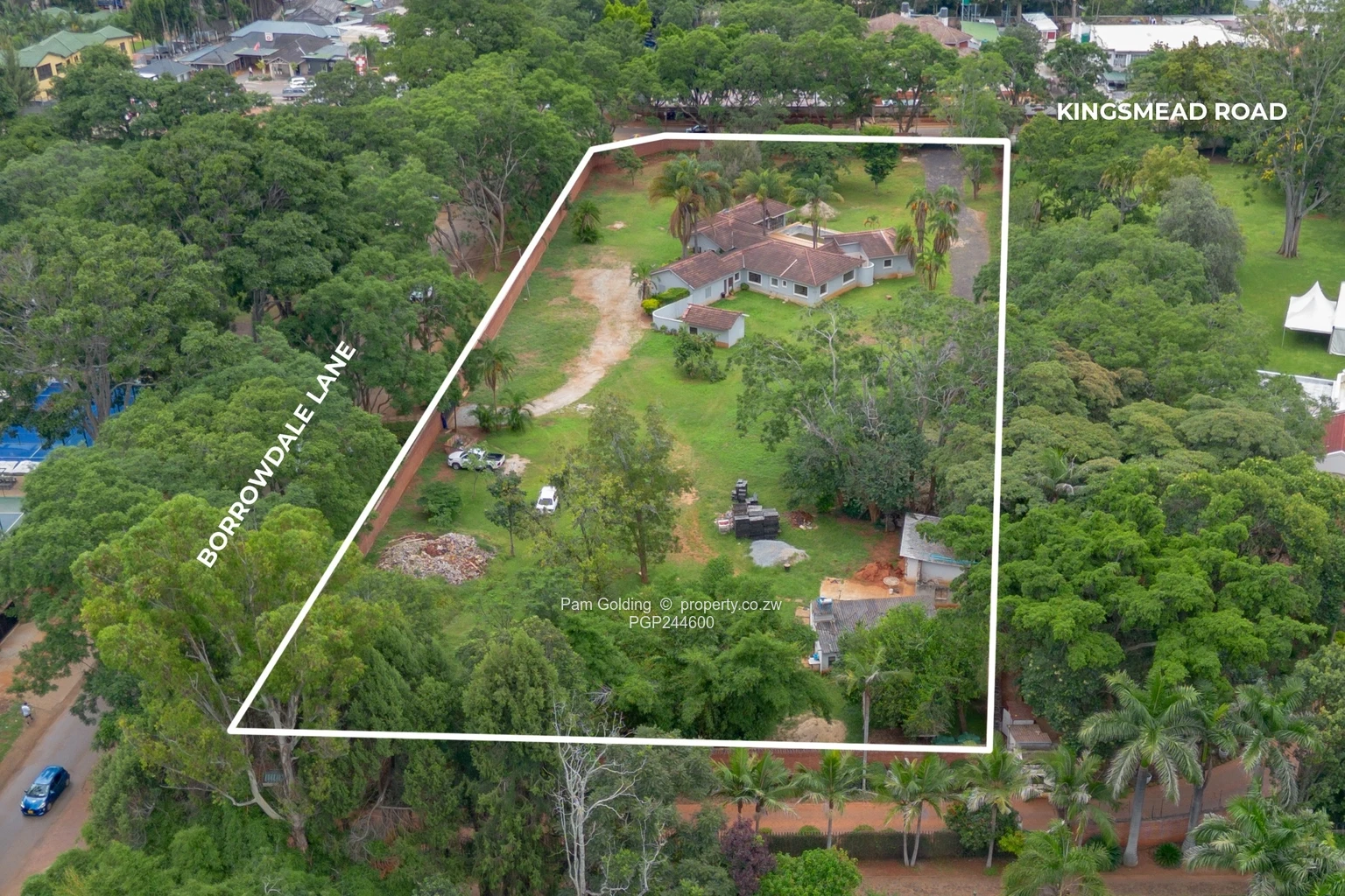 Fully walled and sitting on flat, easy-to-develop land, the property is well-equipped with a good borehole—an increasingly valuable asset. Dual access from both Kingsmead Road and Borrowdale Lane enhances flexibility for traffic flow, design, and future development planning.