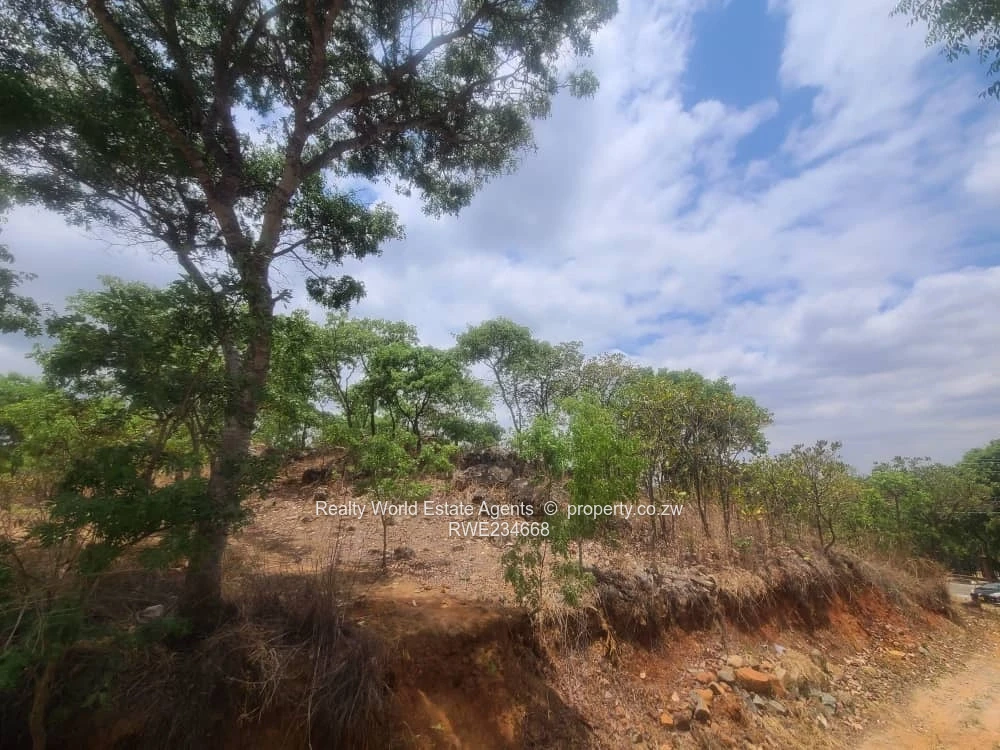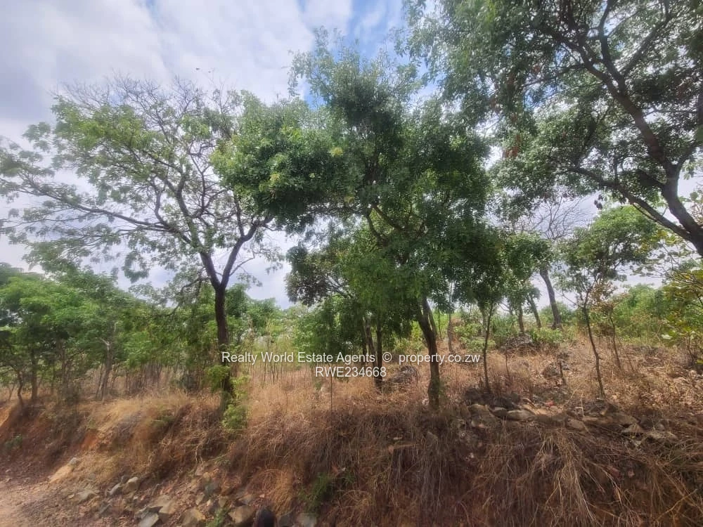 Prime development opportunity in Glen Lorne, Harare North — 16,000 m² of elevated, character-filled land with excellent main-road frontage. As seen in the photos, the property features mature indigenous trees and attractive rock outcrops that give immediate kerb appeal and natural privacy, plus visible stone terraces and a small service track running along the lower boundary. Power lines run along the tarred main road frontage, offering easy access to electricity; the site also benefits from tarred road access to the estate and a quieter dirt access lane internally.