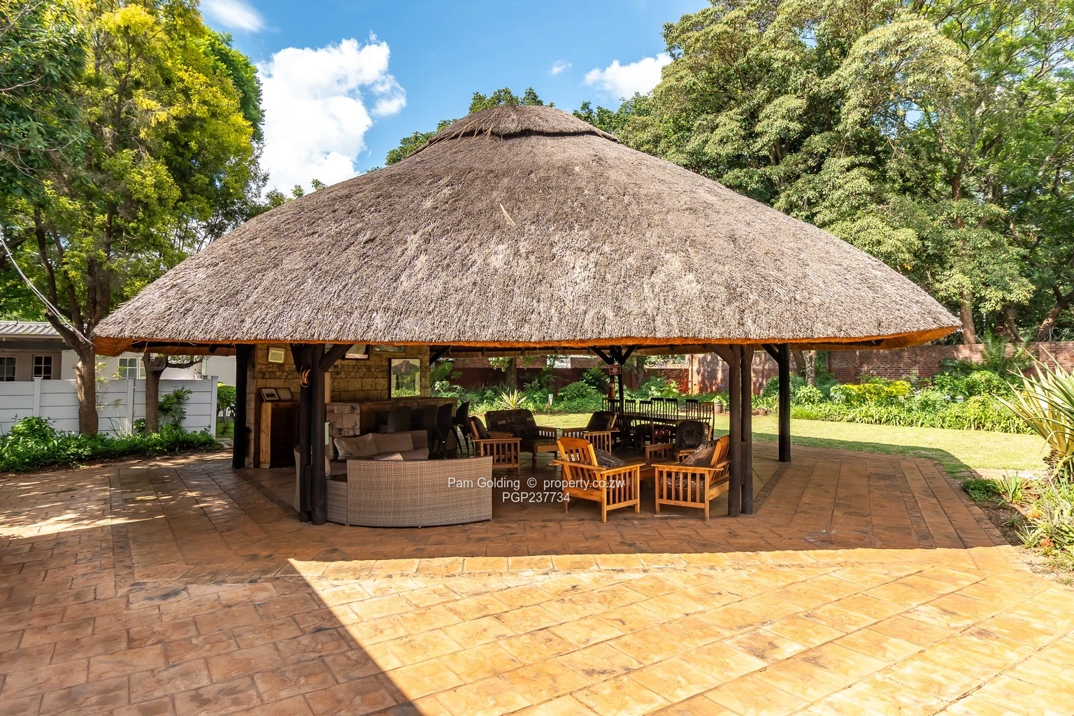 · Entertainment Space: A lovely gazebo with a bar in a green, leafy garden.