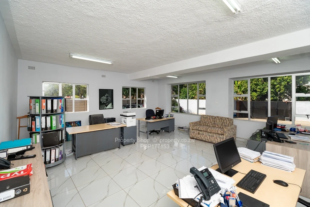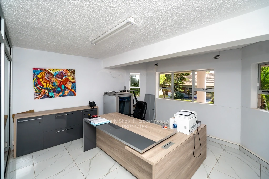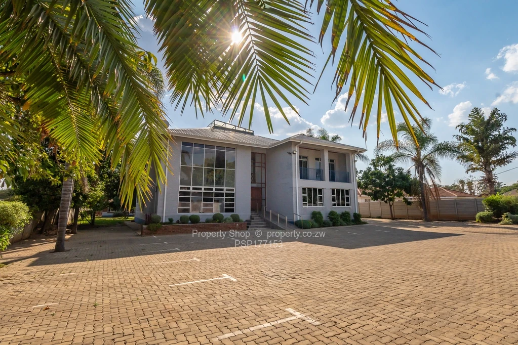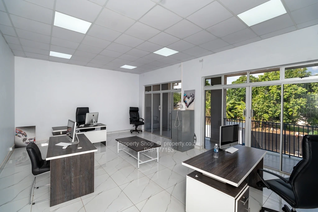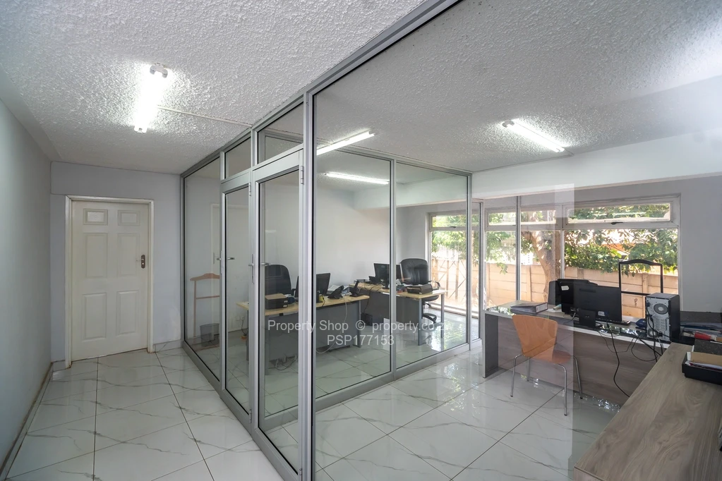 Sitting on 2418sqm is this modern double storey commercial building. On the ground floor it has a reception area, 6 spacious offices including 2 which are open plan. Large air conditioned boardroom with double volume ceiling, fitted kitchen with Caesarstone counter tops and ladies and gents ablutions. The first floor boasts of 3 large offices with balconies and, a fitted kitchen with granite countertops and double ablutions. Single storey cottage with 4 offices, fitted kitchenette and ablutions; swimming pool; Gazebo; Guard room; Double staff quarters; Borehole and 5000l water tank; Paved driveway.