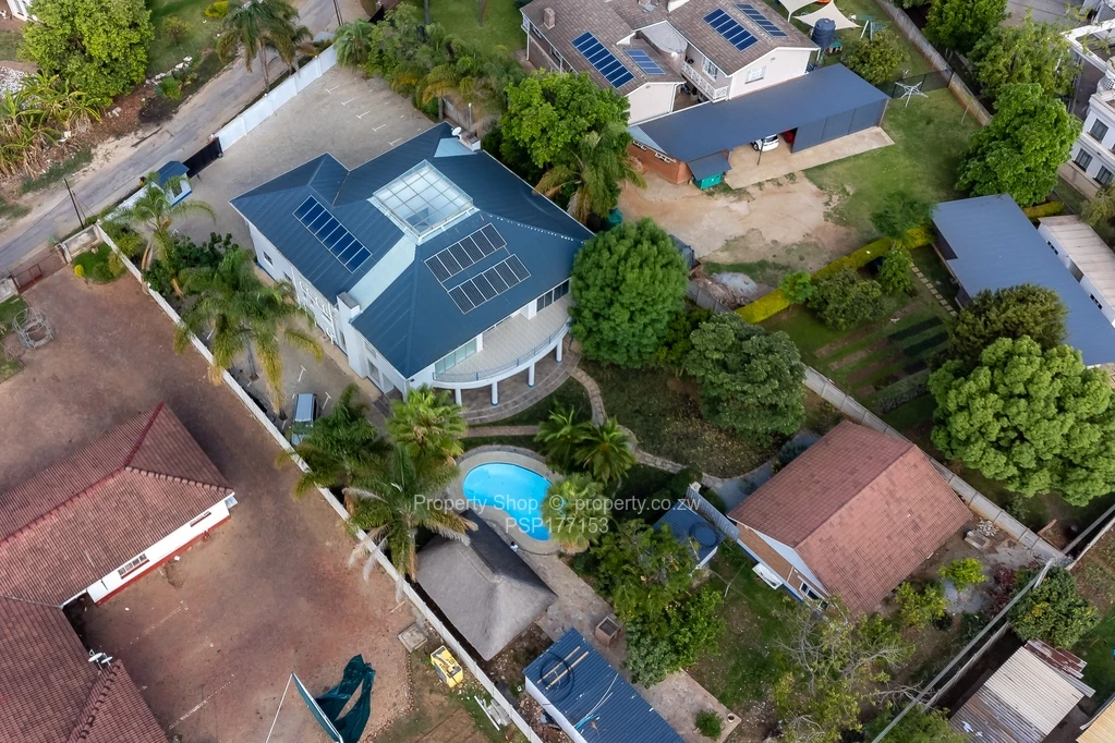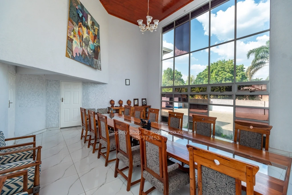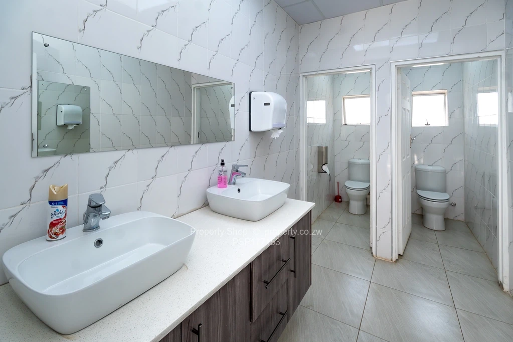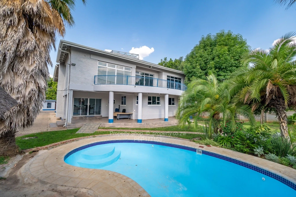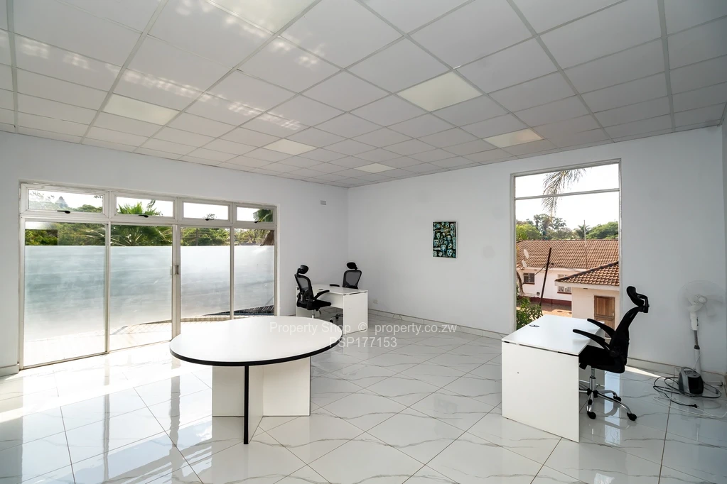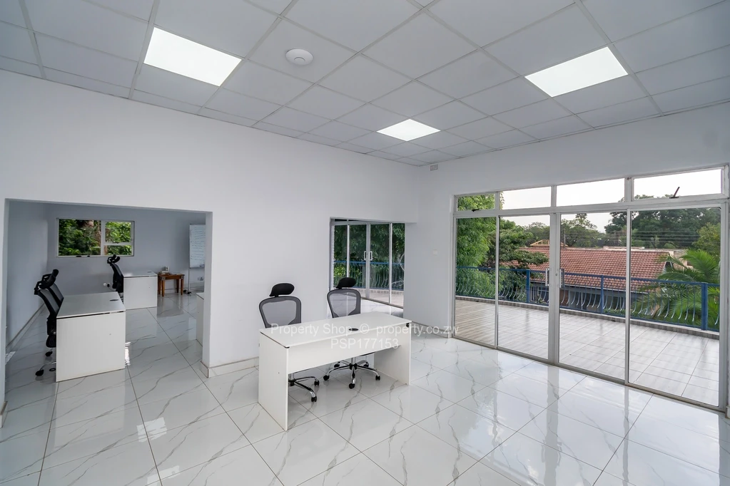 Sitting on 2418sqm is this modern double storey commercial building. On the ground floor it has a reception area, 6 spacious offices including 2 which are open plan. Large air conditioned boardroom with double volume ceiling, fitted kitchen with Caesarstone counter tops and ladies and gents ablutions. The first floor boasts of 3 large offices with balconies and, a fitted kitchen with granite countertops and double ablutions. Single storey cottage with 4 offices, fitted kitchenette and ablutions; swimming pool; Gazebo; Guard room; Double staff quarters; Borehole and 5000l water tank; Paved driveway.