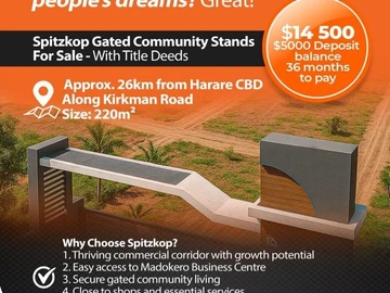 Prayer City, Spitzkop offers a fantastic opportunity to own a 475m² stand, perfect for building your dream home or investing in the growing area. Located off Kirkman Road, just 900m from Byo Road, this property is priced at $15,000 with developer cession. Don't miss out on this chance to secure a plot in a promising neighborhood. Get in touch with Tatenda for more info or to schedule a viewing.