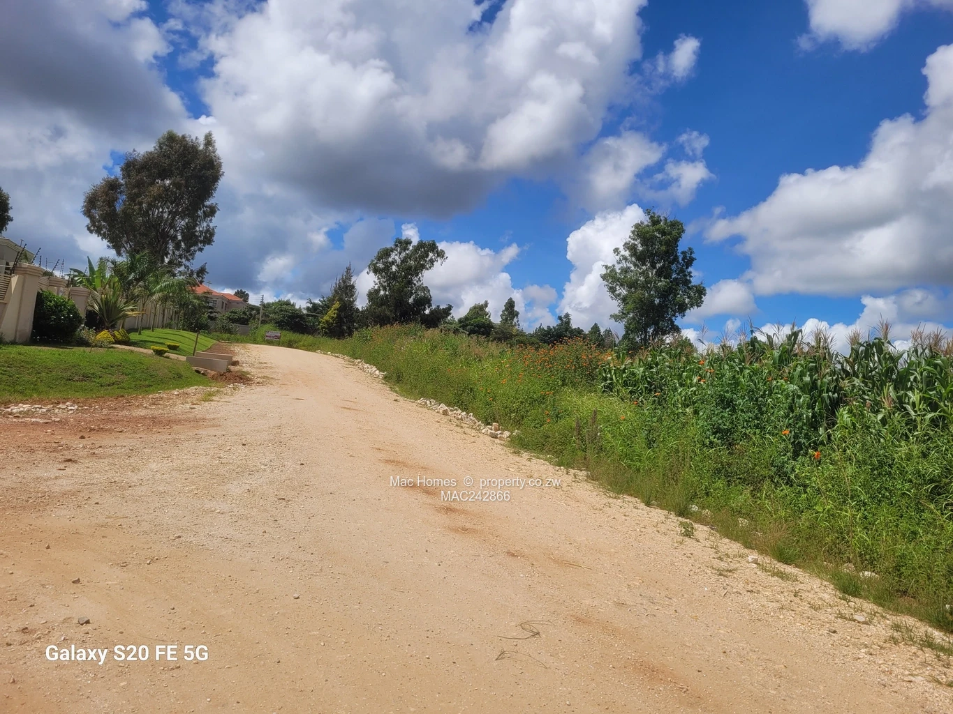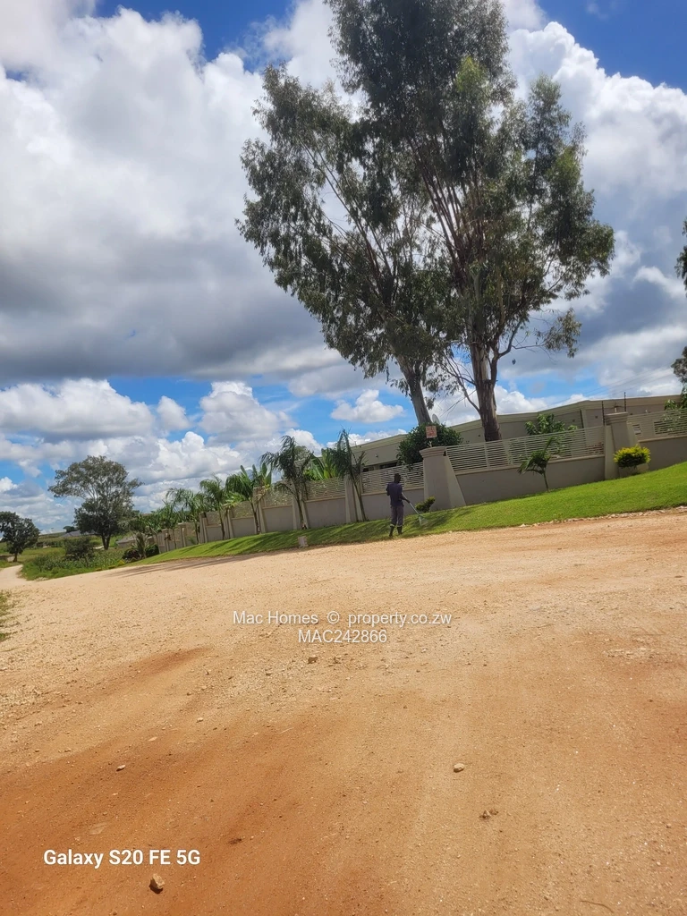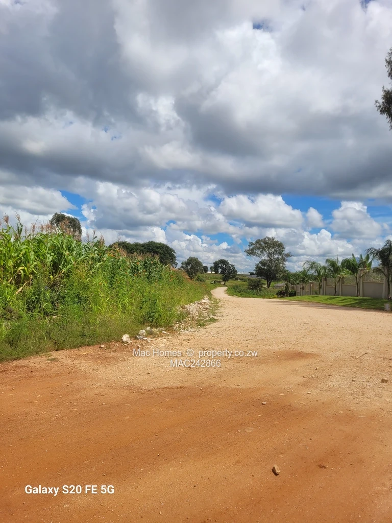 Prime 2,400 m² residential stand in coveted Hogerty Hill, Harare North — an exceptional opportunity with strong subdivision potential. Set along a well-maintained gravel road, the property offers easy vehicular access and a peaceful streetscape: mature boundary walls and manicured gardens line one side while open green fields and a patch of maize on the other preserve privacy and country charm. The gently rising terrain and expansive, cloud-studded skies captured in the photos promise elevated views and excellent natural light. Ideal for a luxury family estate, a multi-unit development, or to subdivide into smaller stands (subject to council approval). Quiet neighbourhood, secure feel, and convenient access to northern suburb amenities. Viewings by appointment — secure this rare Hogerty Hill parcel today.