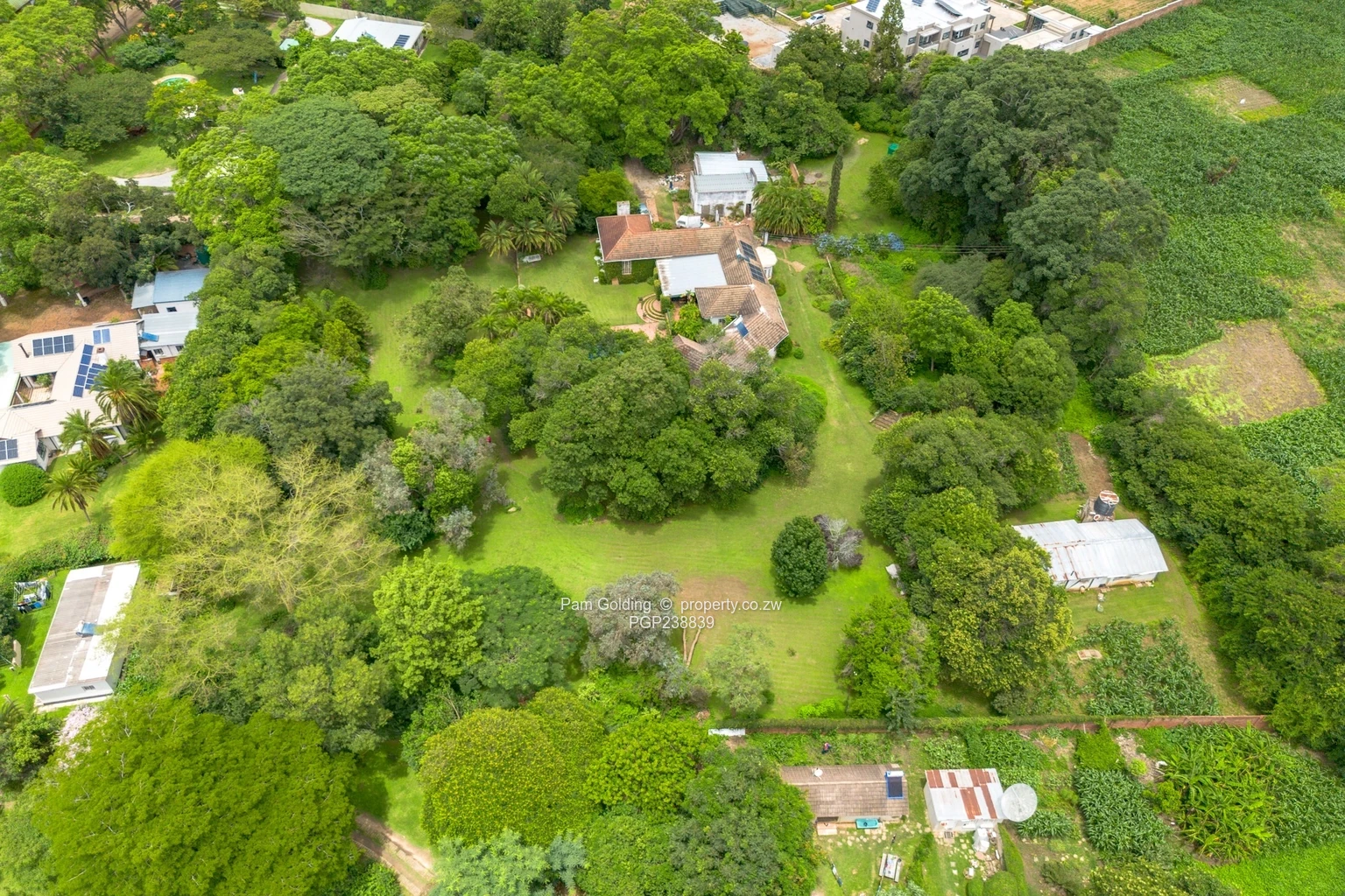The property is enhanced by numerous mature trees, creating a tranquil, shaded environment with a strong natural presence — ideal for a private family home, or a premium development.