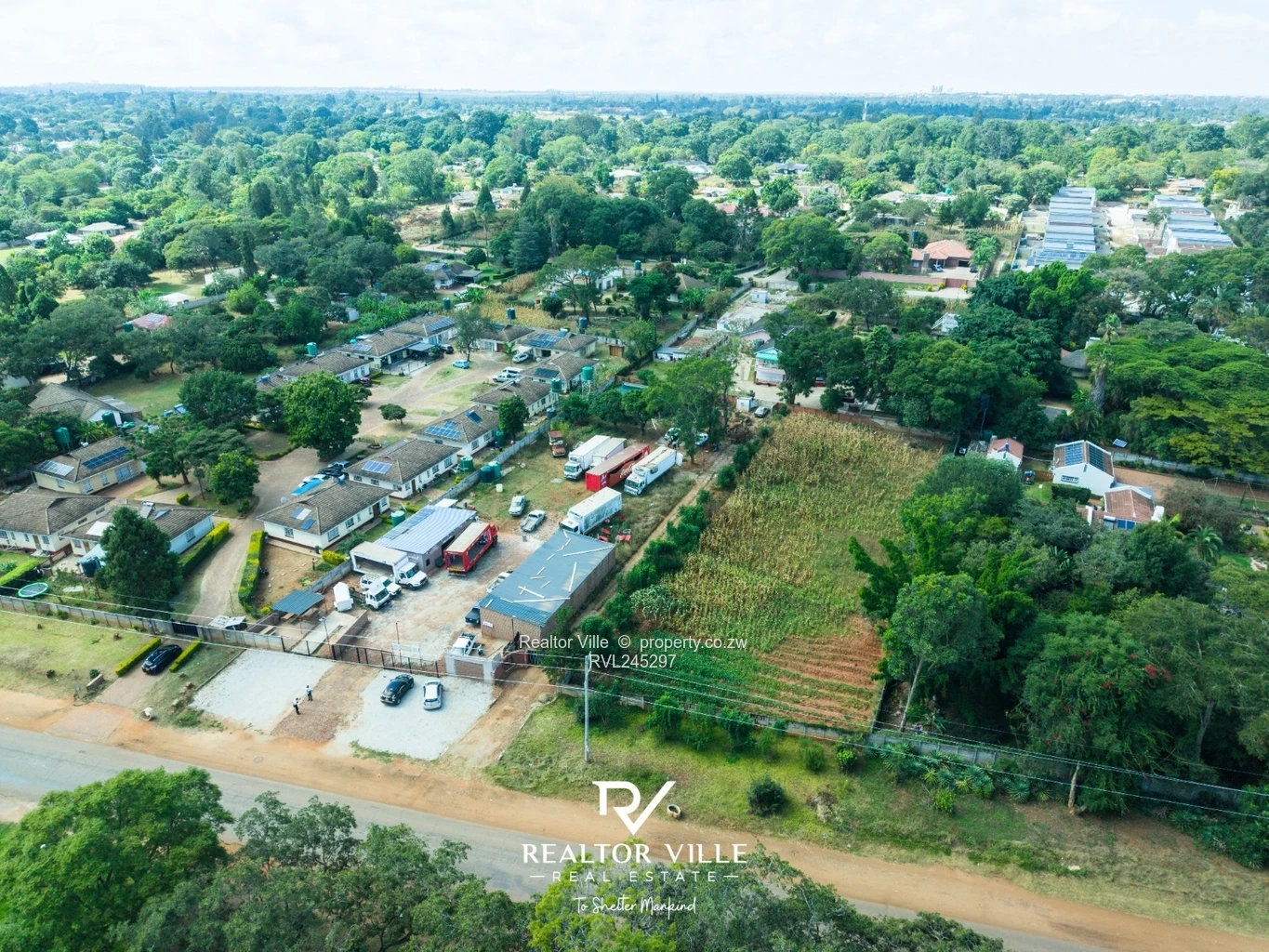 Prime development opportunity in Greendale, Harare East — a 6,000 m² stand with excellent main road frontage and immediate subdivision potential. As seen in the aerial photos, the property presents a well-defined rectangular parcel with a secure walled entrance, gated parking area and a compact site office/yard already in use, making initial site work straightforward. The gravelled frontage and visible power poles along the road provide easy services access, while a functional sewer connection is confirmed for smooth approvals and rapid development.